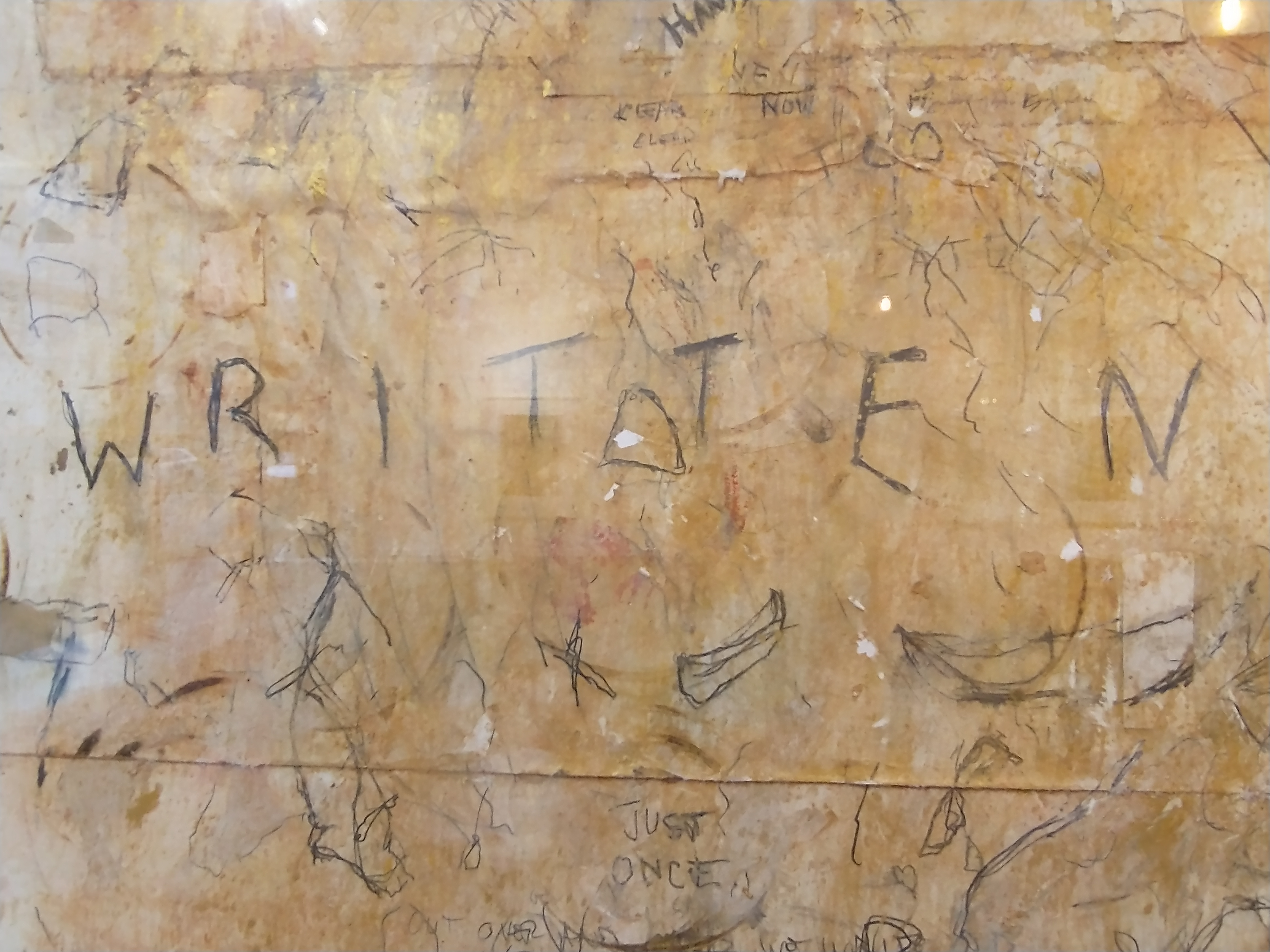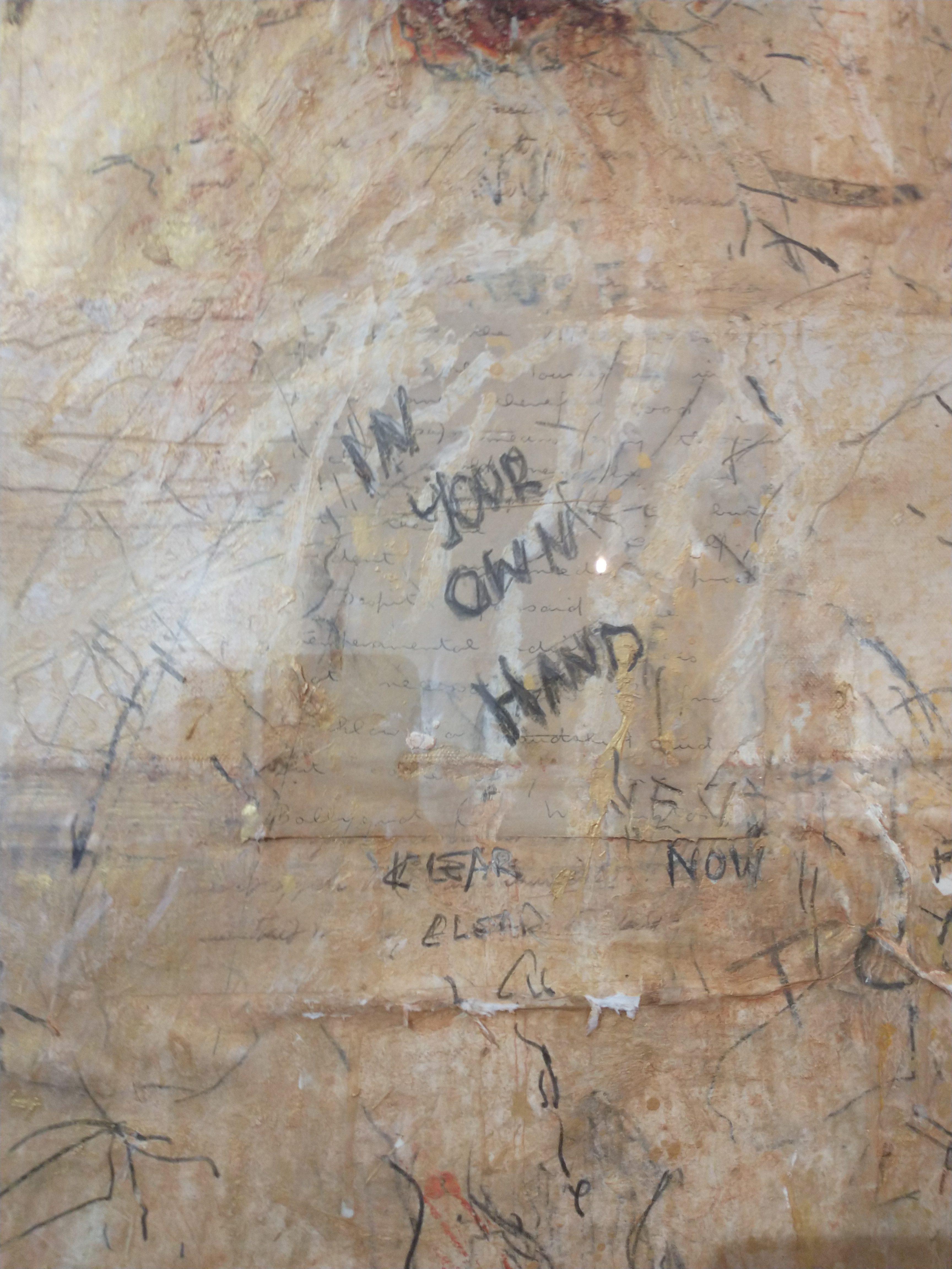 This amazing piece is made with oil, pencil, wax, and collage pieces and is well named “Written in Our Own Hand.”