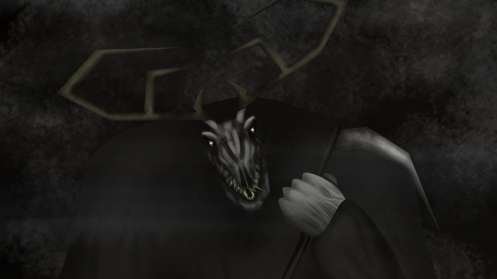 The trailer begins with Bruce’s Mom (Bruce & Buster are the two, partnered protagonists) standing frazzled in a dark environment. There is a sudden jump scare with the Deer Demon’s long, snake-like tongue coming into camera shot and latching itself into her throat. It then slithers its way deeper inside her in an effort to devour her soul. She convulses and begins to bleed out. Now front-facing, the Deer Demon is revealed and lifts up his scythe to decapitate Bruce’s Mom off camera. Finally, her decapitated head is layered in gore and mounted on the wall. The camera zooms in on her dead mouth, and the game cover and “PREORDER NOW” call to action fade into view.