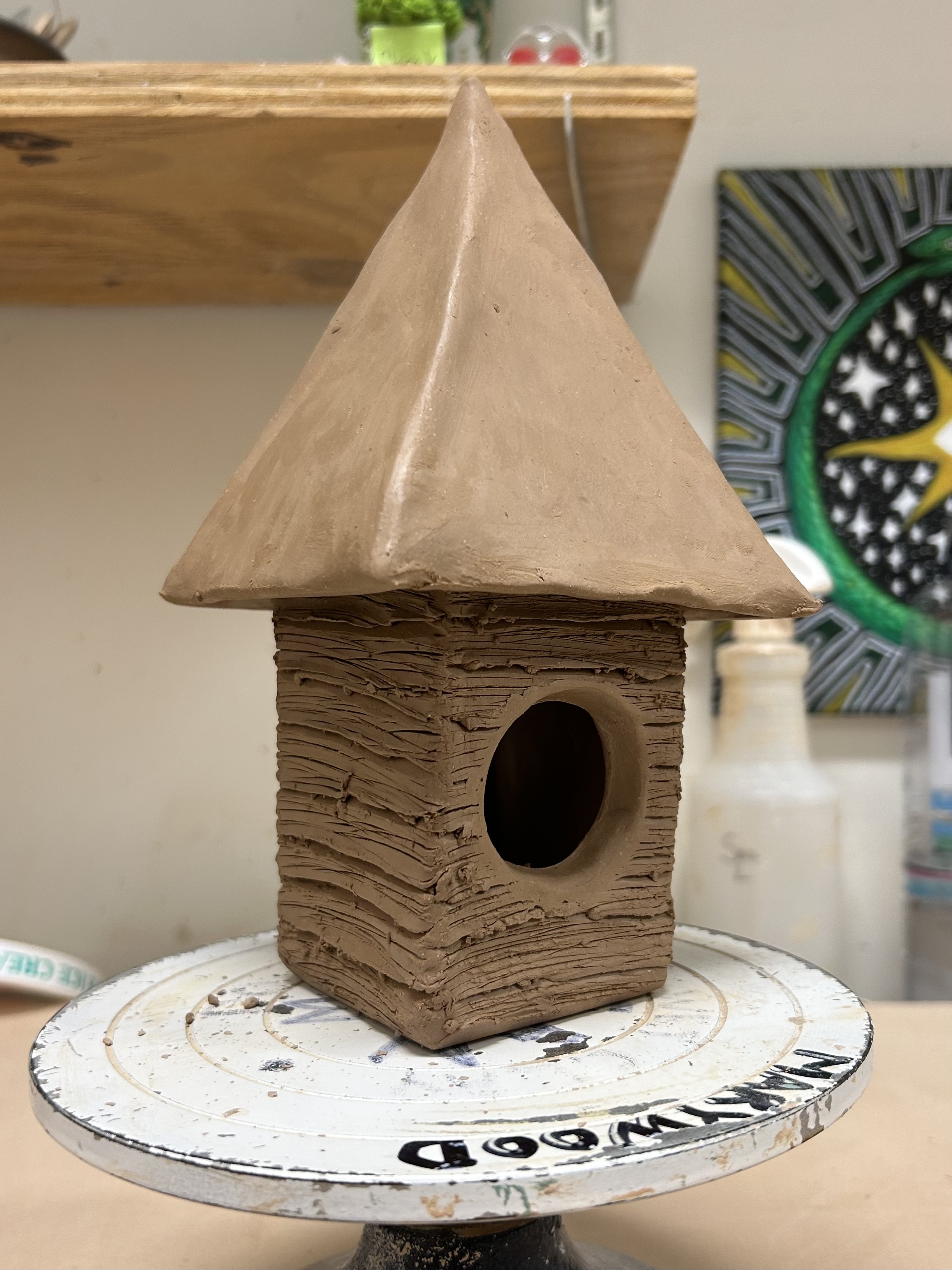 Lastly I attached the legs onto the bottom of the hut. I use a leveler to make sure the house is even and not leaning or crooked. It takes a while for me to figure this part out. Now, The Hut is hanging out and drying, waiting to be bisque fired.