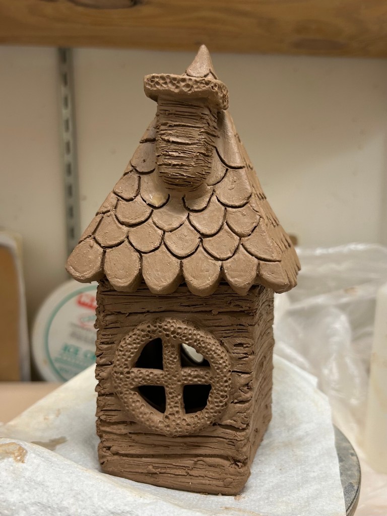I’m feeling happy to be working with clay again! I spent time in the summer coming up with plans for what I wanted to make and I’m excited to start working on them. Day 2 I started making my first small Baba Yaga Hut. I knew that this time around I wanted them to be used as incense burners or candle holders so I made the roof a removable lid and hallowed out the windows and the chimney so light or smoke can pass through. I made the initial house shape from slabs and then added the texture as well as the windows, doors and chimney.