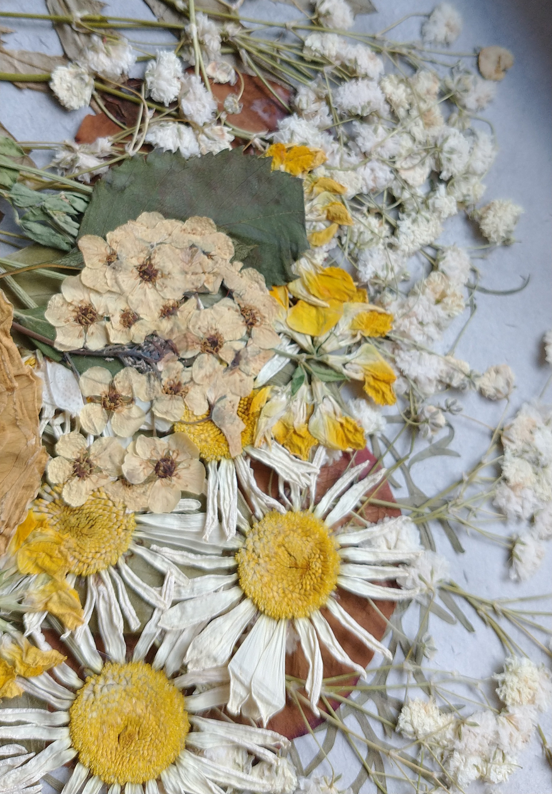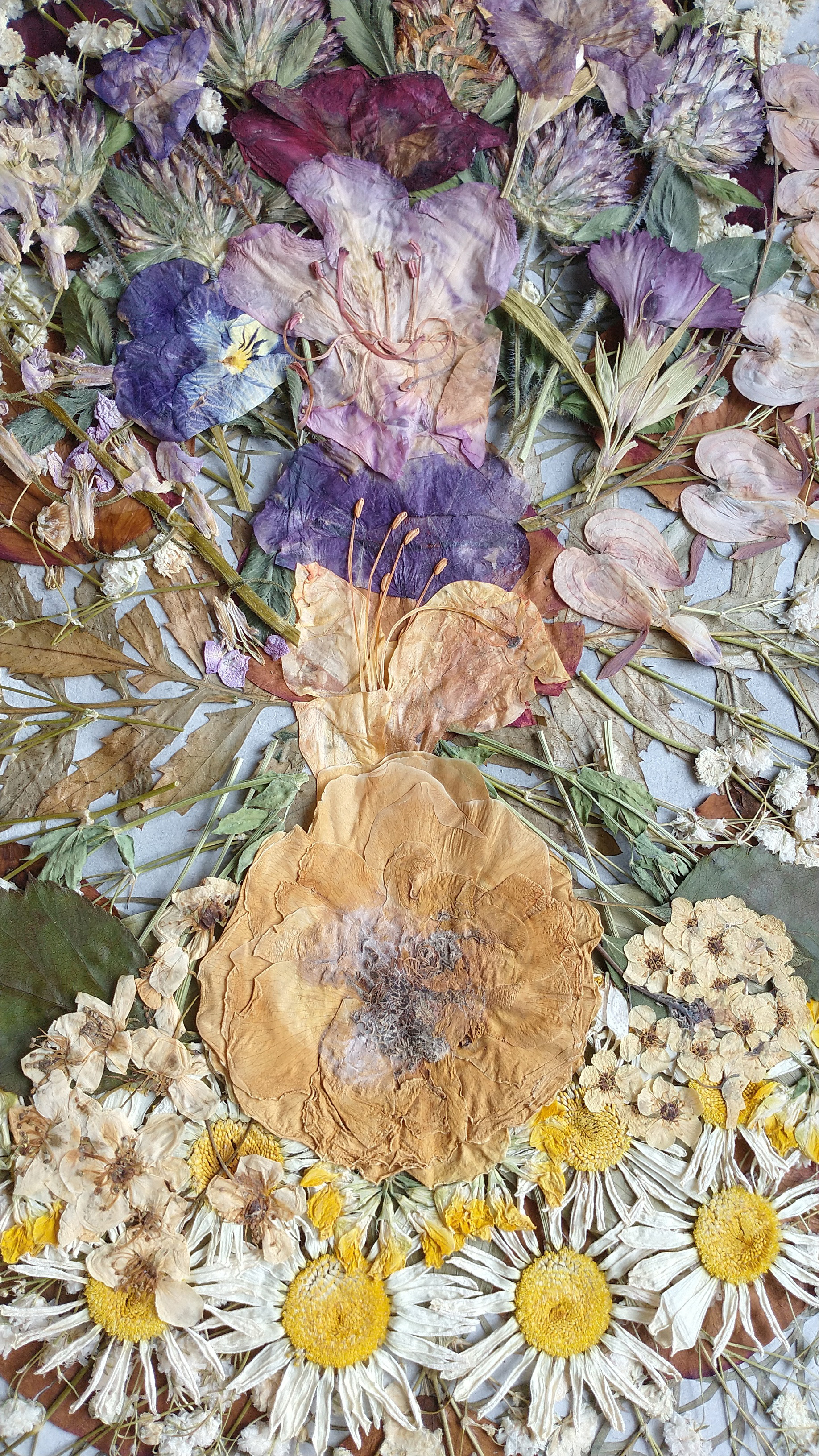 For years I’ve been collecting flowers and pressing them in a flower and leaf press my Nana gave me. I always loved how they came out and the fact that it immortalizes them. I’ve used them in gift cards, wax seals, and scrapbooks, but I wanted to do something more with them. So, I had the idea to create an art piece using pressed flowers and leaves exclusively. I centered the piece around the colors purple and yellow, which are complimentary, and just so happen to be the primary colors of flowers I had.