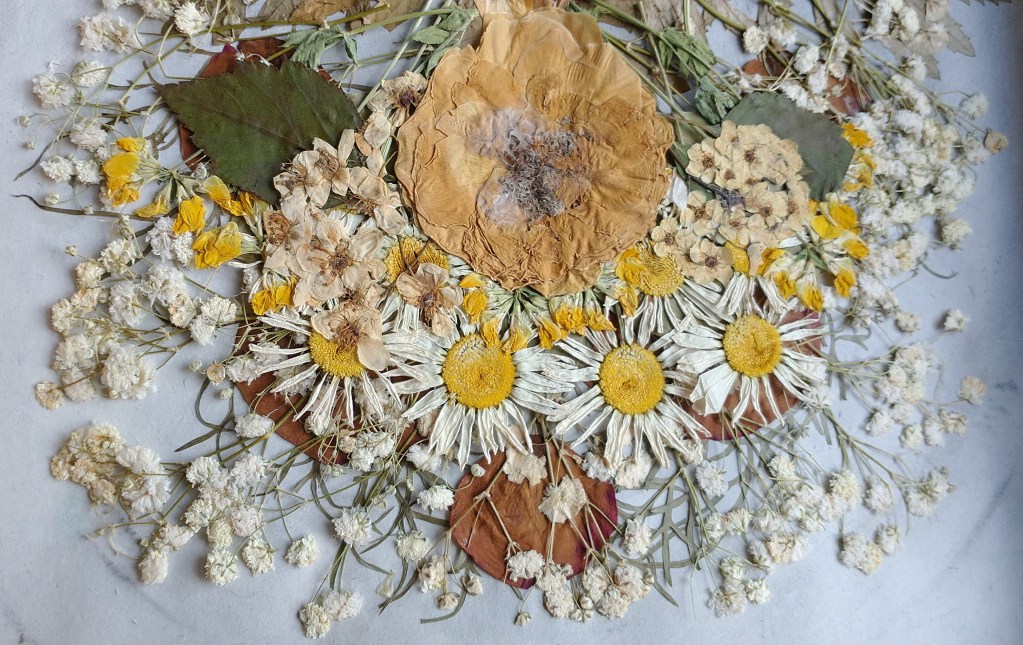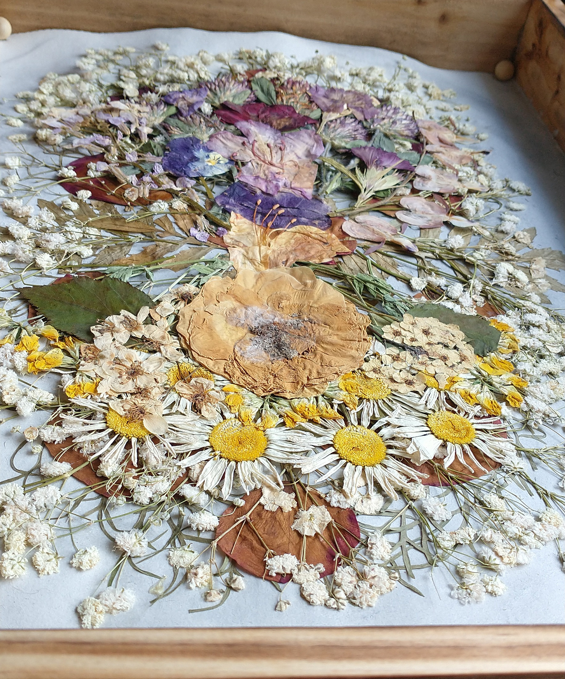 I started this by placing the leaves and rose petals and other flowers in different formations to see what fit best. Eventually, I got it at a place I like. So, layer by layer, I placed Elmer’s glue on the backs of the leaves and flowers with a paintbrush, being extremely careful as they are very brittle. Between layers, I placed a flat weight on top to help secure them.