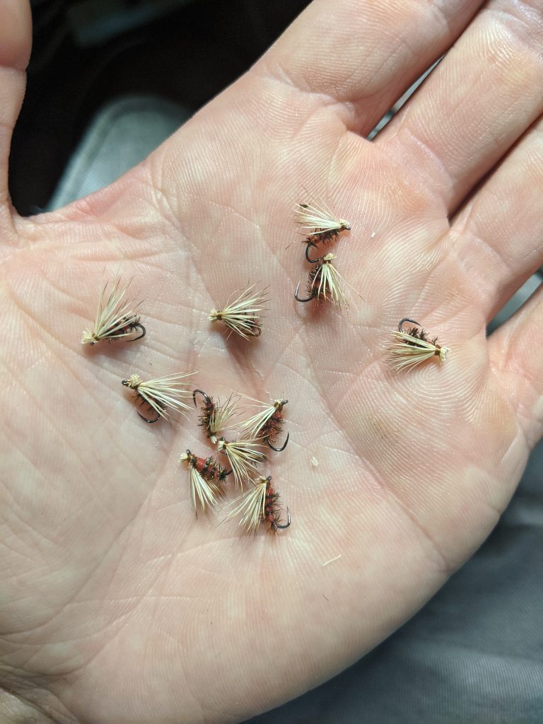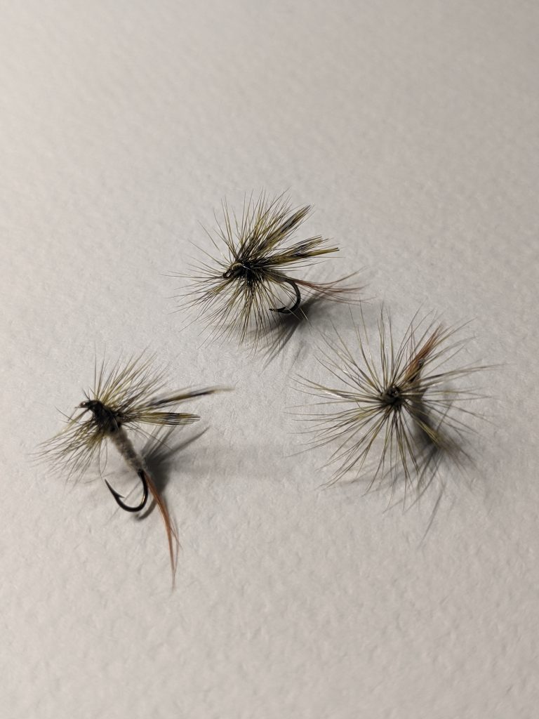 Shown above are two very popular patterns and two of my favorite flies, both how they look and fish. The left image is of the ever so famous Caddis dry fly which is the adult stage of a common and wide ranging bug known as the Caddis. These flies are liquid gold on small native streams and when in doubt, tie one of these on. The right image is that of an equally famous dry fly called the Adams, it is a general imitation of a hatched insect and covers a variety of mayflies.