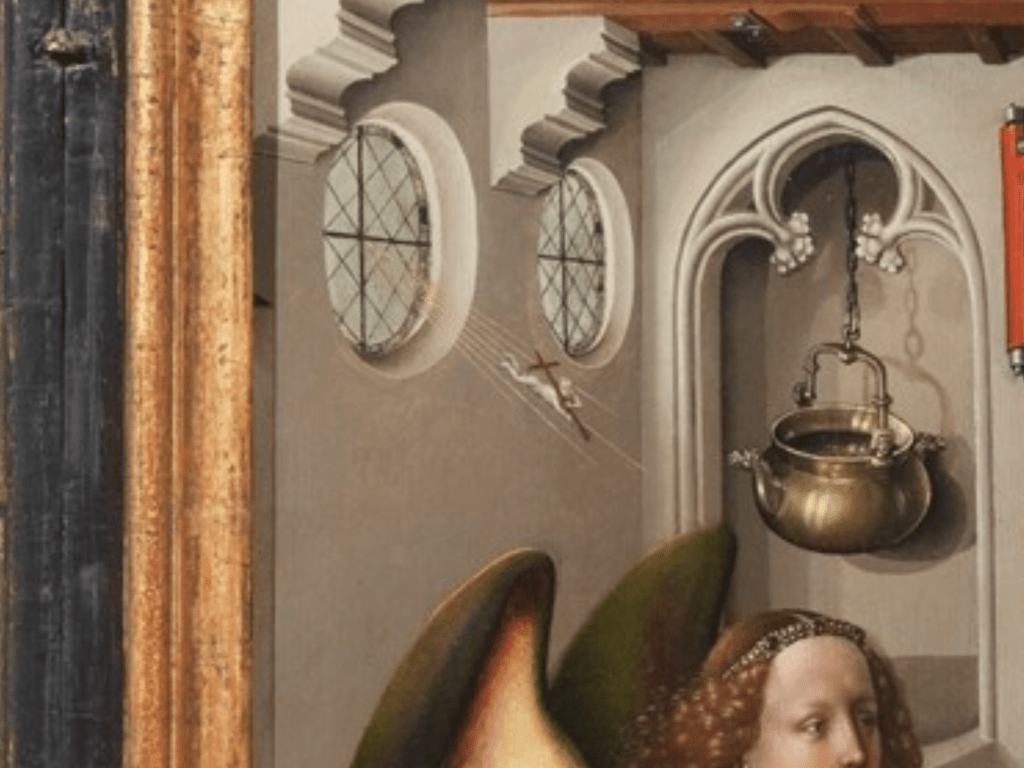 While I could go on for years and years about the symbolism of the center panel, I don’t want to draw this out for 10 pages! So, let me draw your attention to the strangest (and best) part of this painting. This is a piece of symbolism that is totally out of the ordinary, and isn’t used in any other renditions of the annunciation. If you zoom in towards the windows in the back left of the center panel, you will see flying baby Jesus. Yes, flying baby Jesus. He rides through the air on a cross, carried by seven golden rays of heavenly light. Just as Gabriel enters to tell Mary of her fate, Jesus flies in to collide with her and begin the story. It’s so small and easy to miss, but nevertheless it’s there. Every time I get to talk about this painting, he’s the first thing I bring up. It always gets a chuckle out of anyone I’m talking to, especially if they’re unfamiliar with art history and this altarpiece. I just love to imagine Campin laughing as he paints, and the patrons and viewers smiling at Jesus pulling a Superman to enter the world. I would have loved to hear the discussion on the exact reason this imagery was chosen, but unfortunately we’re all just left to guessing, and appreciating this small, flying baby Jesus, in this incredible work of art.