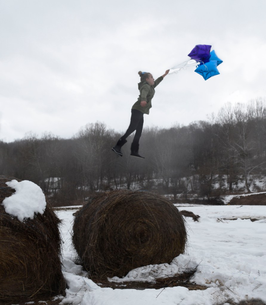 For the first photograph I took a photograph of a bale of hay, then I added a chair to the bale and my sister on top with balloons in her hand like she was flying away with the balloons. For the second and third photographs I took a photograph of my driveway in between the snowflakes that day, then I added a stool and my sister again with the balloons and had her pose in different ways.