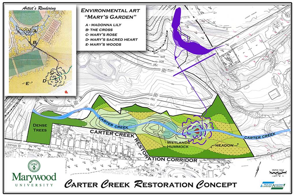 Pamela Parsons and I also co-direct the Fresh Perspectives-New Solutions Visiting Environmental Artist Series. For years we have built an association and friendship with Patricia Johanson, one of America’s first—and premier—environmental artists, who has visited campus a number of times and has worked with our students. Johanson creates art on the land while literally healing it, at the same time respecting its human history. A number of years ago she designed Mary’s Garden for Marywood, with funding from the University and the Willary Foundation. The result would provide multi-use spaces for outdoor classrooms, a spiritual retreat, and passive water filtration ponds, all in the shape of a sacred lily and rose. The project would remediate mine-scarred campus land behind the playing fields while paying homage to the region’s mining heritage and to the University’s founders, the Sisters of the Immaculate Heart of Mary. We have hopes that it will be constructed as a beautiful, appropriate, and needed campus asset.