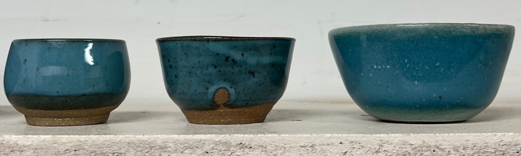 First, I want to show you a few of the results from my glaze, which I’m thrilled with. I used various combinations and techniques to apply glaze for these, so it’s so cool to see them all next to each other. The two pieces on the left are tea bowls, and I love how their forms turned out. I also love the finger marks I left on the middle piece because they add a really personal touch.