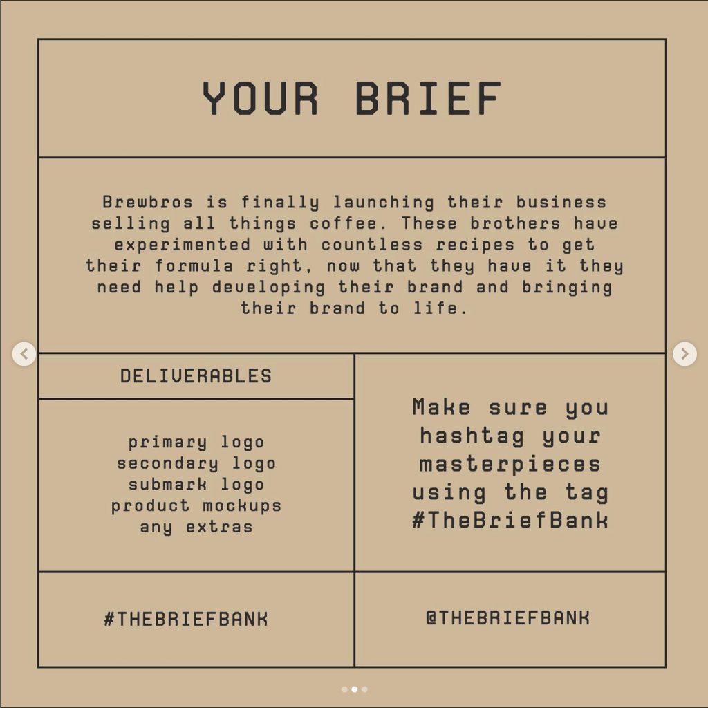 A regular brief is a design prompt that provides hypothetical companies and start ups for you to create logos, branding and designs for. There are numerous accounts that are specific for posting weekly or bi-weekly briefs that designers and artists around the world can participate in. A brief will provide a small description of said company and the design requirements such as primary and secondary logos, watermarks and packaging designs. Some briefs will give you a recommended color palette, although you have full creative freedom to choose and design what you want!