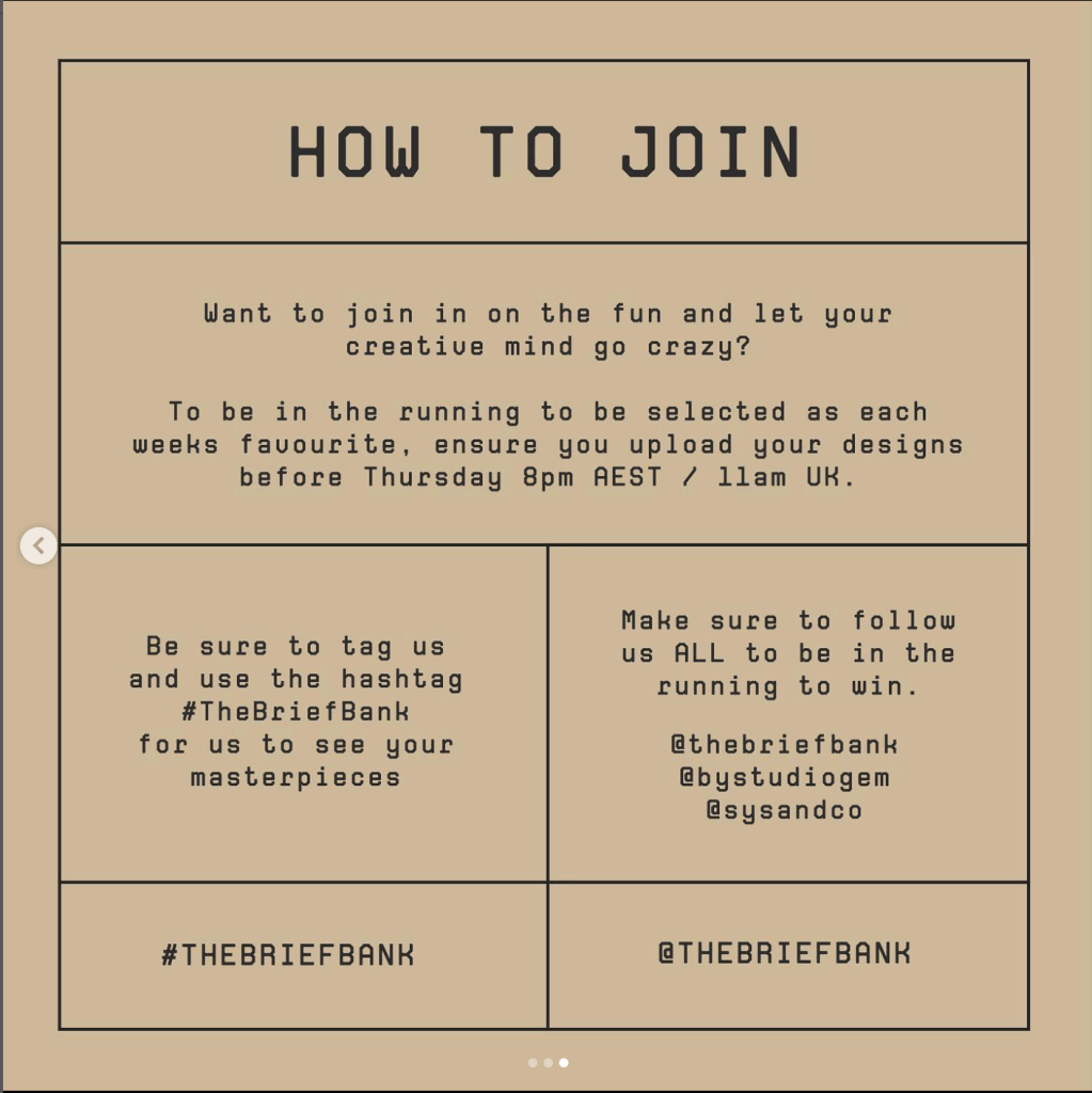 Briefs are a great way to stay creatively active during summer months and breaks, as well as keep your skills in the computer nice and sharp. They’re super easy and are social media based so you get to work on presentation and display of your work which has been super fun, helpful and beneficial for my designers skillset.