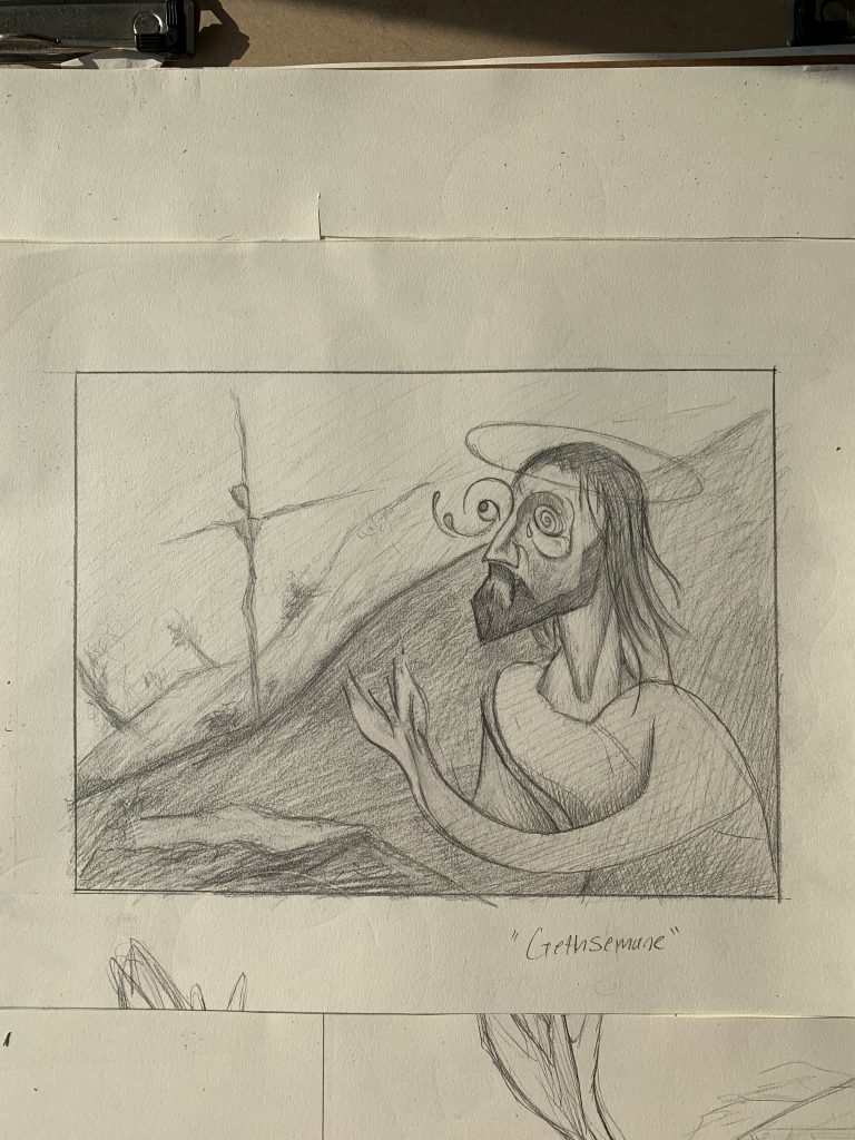 Last week I stated that I would be starting a new this semester and delve into a more religious themed style of painting, so this week I’d like to share with you all how that’s going. I’ve chosen to make a painting series based around the final days of Jesus before his crucifixion and leading up to the moment he ascended, leaving this earthly realm behind and taking his place on the throne of the next kingdom that awaits us. I am Starting out with the night before his execution where Christ prayed in the garden of Gethsemane. I want to portray the mental and existential anguish Jesus the man must have felt as he begs god to “take this cup” away from him in a last ditch effort to save his life.