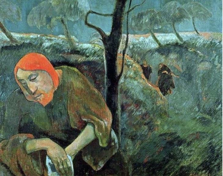 I have mapped out the overall composition and meaning of the piece I now need to think about how I’d like to paint the thing. I still need to contemplate this endeavor a bit however I am thinking about taking further inspiration from this Gauguin piece and integrate the figure with the background with colors that echo throughout the composition. This is partly because it will make for a more interesting final product but also to show Christ’s connection to the earth that he must now leave behind. I believe this would give more symbolism and emotional weight to the the painting.