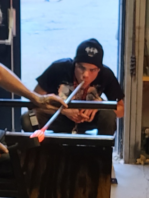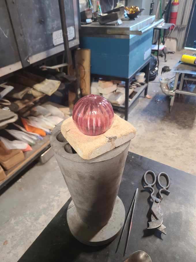 The class is only about 45 minutes. the teacher gave us a run down about the process behind glass art, as well as all the safety procedures that we had to take. It is extremely hot in the studio and the oven is hundreds of degrees Fahrenheit. Furthermore, handling hot glass was dangerous and we had to wear safety goggles and hold the molten glass by a metal rod. Anyways our main job as the inexperienced learners was to pick our colors, and to blow through the hole on the other end of the metal rod as the teacher rolled it back and forth. This process is what created the spherical shape for our design. After that, the teacher then added a stem of molten glass to the top to create the stem for the pumpkin.