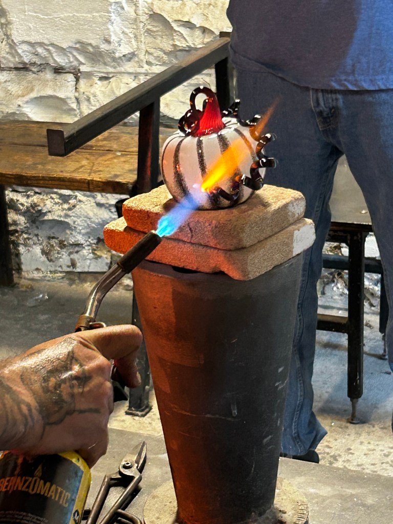 This is my pumpkin as the teacher uses a blowtorch to mold the stem and pumpkin together.