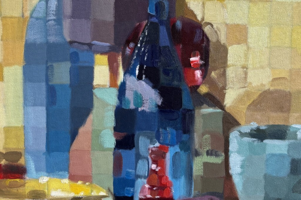 This still life focused on using a full palette and complimentary colors. We started it by making a 1 x 1” grid on our canvas, and sketching on top of it. This was probably the fastest I’ve been at getting proportions right for a still life too! I really only made one single sketch on canvas for this and didn’t have to fix too much.