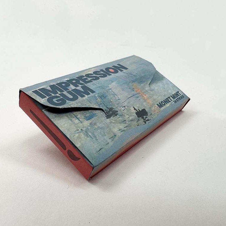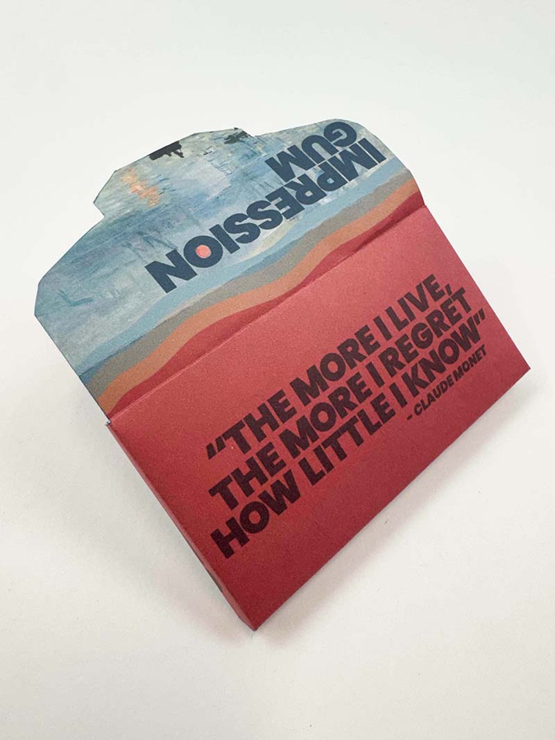 I really wanted the front flap of the package to come together to make one seamless photo of Monet’s painting, Impression, Sunrise. For the colors of my design, I used colors I found in the painting to create a more cohesive palette and design. Once I finished my design, it was time to do some test prints on printer paper to make sure that my design worked and lined up correctly. On my first test print, the painting did not quite line up, so I had to adjust the design so it would line up. I also had to adjust some of the colors because they printed out too light to be properly legible on the design. I also designed some gum wrappers to put inside the final result.