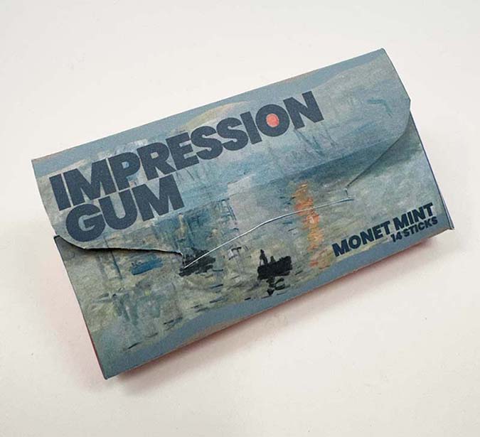 I really wanted the front flap of the package to come together to make one seamless photo of Monet’s painting, Impression, Sunrise. For the colors of my design, I used colors I found in the painting to create a more cohesive palette and design. Once I finished my design, it was time to do some test prints on printer paper to make sure that my design worked and lined up correctly. On my first test print, the painting did not quite line up, so I had to adjust the design so it would line up. I also had to adjust some of the colors because they printed out too light to be properly legible on the design. I also designed some gum wrappers to put inside the final result.