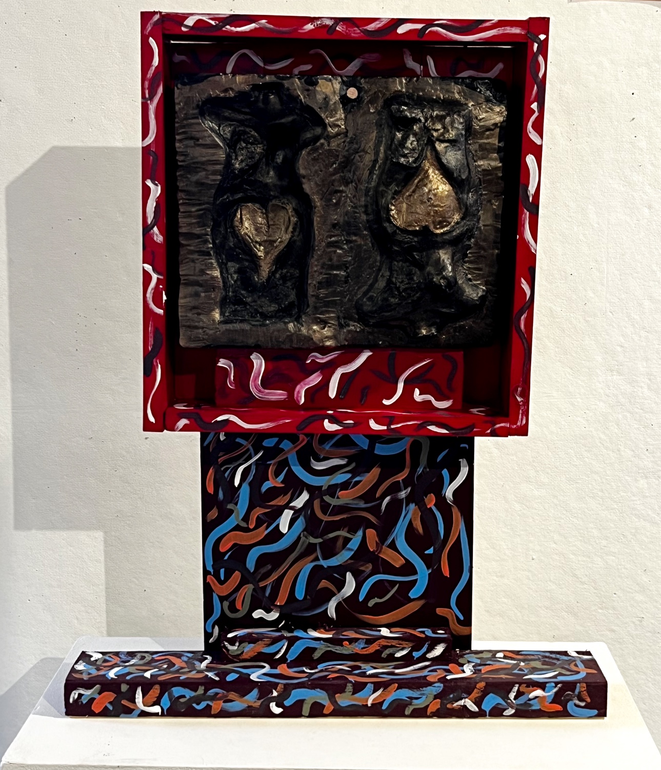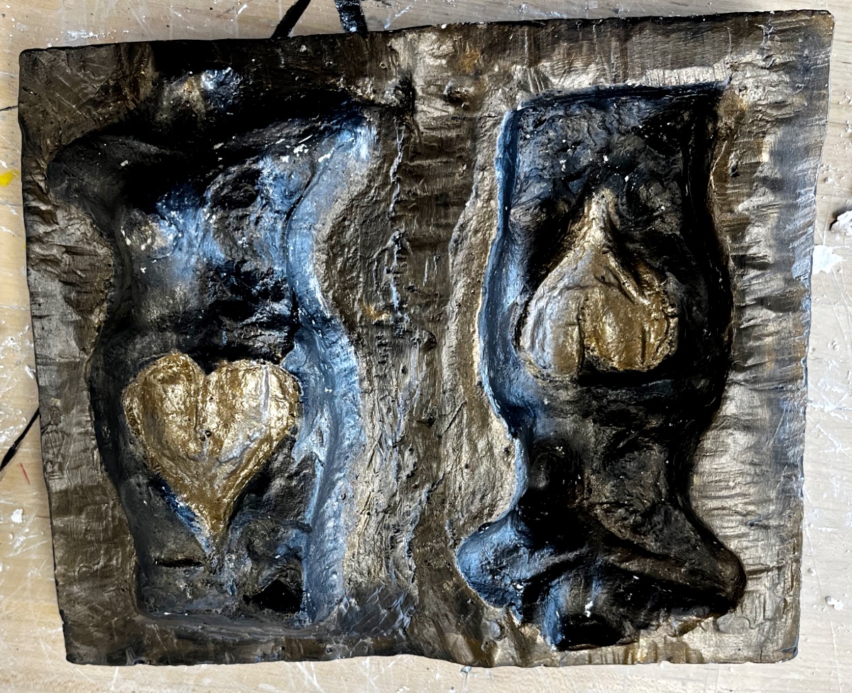 I wanted to use the paint to make it look like bronze but still make the torso and heart very distinct. I put this second paint on the heart pretty thickly. On the torso I went incredibly light with the paint and then on the rest of the piece around the torso I put more on but not as much as I put on the heart. After the piece was painted my professor and I discussed making a frame or a stand for it. Ultimately we decided that it looked really interest with a framed stand.
