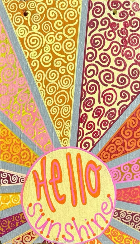 After that, I picked my colors—warmer tones for the sun to contrast the cooler-toned gray background. Once the rays were dry, I grabbed my all-time favorite writing utensil, posca paint markers, to add swirly designs to each ray. I outlined them for definition and then moved on to the scariest step: writing “hello sunshine.” I needed my handwriting to be just right. To my relief, the letters came out better than I expected!