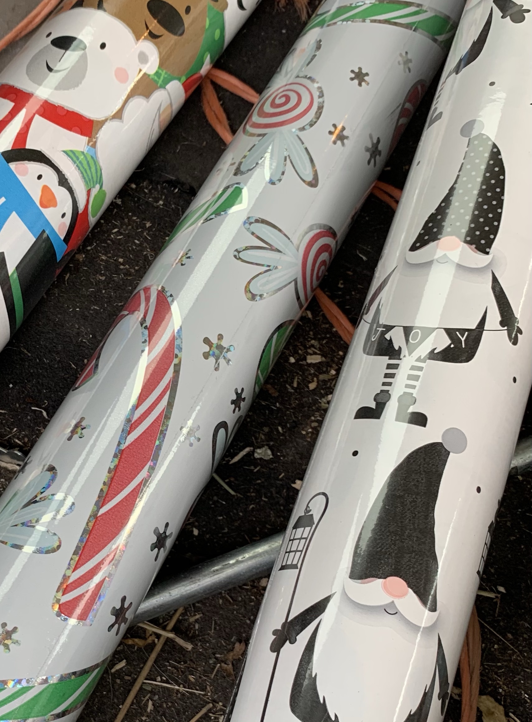 The next thing we did was go out and buy wrapping paper and ornaments to brighten up our stash at home. I was taken away by how many different patterns and designs are out there for ornaments and wrapping paper.