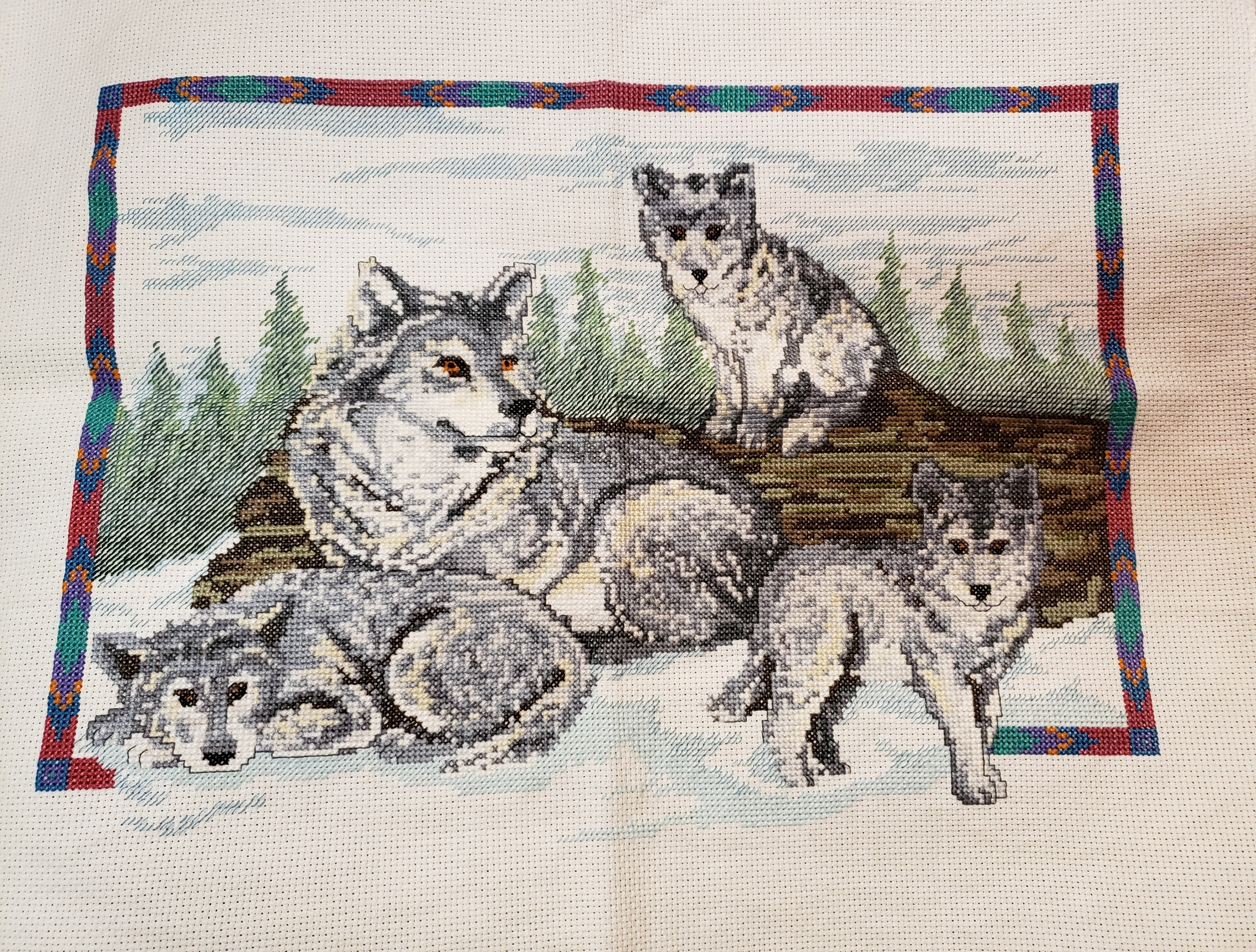 Over the years, I have done many kits for myself and others. I once did a kit of a family of wolves (by Designs for the Needle: Nature’s Window-Wolf Family) for a now ex-boyfriend. Kind of glad to not do anymore wolves. Still, someone thought I like wolves and gifted me, to my chagrin, a family of wolves’ kit. I laughed as it was the same kit that I had done for that ex. I really resented the Universe for gifting me this particular arrangement and left the kit buried under a pile of projects.