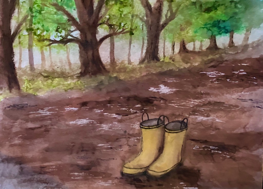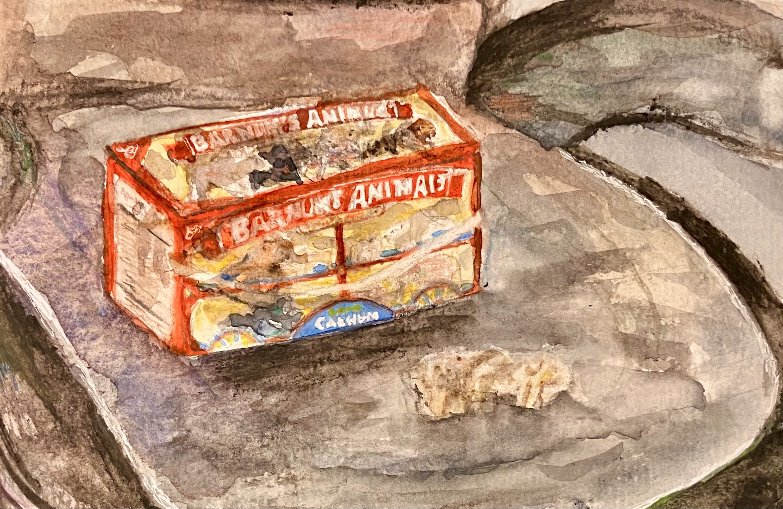 The next piece I made was this swing I had at my grandma’s place. I was trying to do this black outline with pen thing. In the end I eventually tie it in but my first few pieces didn’t really execute it well. I’m not sure if the turtle sandbox in the corner is very clear compositionally. I could’ve taken more time on my sketch to iron out those composition problems. You can see in the forest in the background that I’ve improved since the last piece. Even if it’s small, it adds up. The piece after this is a memory I have in a reversed car seat at dusk staring up out of the skylight. This one has a few strong points. I like the light and the tree, as well as the color I was able to achieve for the sky, but the shading on the inside of the car is really rough. The proportions in general are really inaccurate. Some of this helps create the idea that it’s an old, warped memory. Some of it is just skill issues. This next piece, my skill level went back to the beginning. My proportions aren’t awful and I think it’s pretty clear that it’s an animal cracker box, but my paint is streaky and I’m not happy with my contrast. This is a dip in my improvement, but that usually signals that it’ll go up way higher after. This held true.