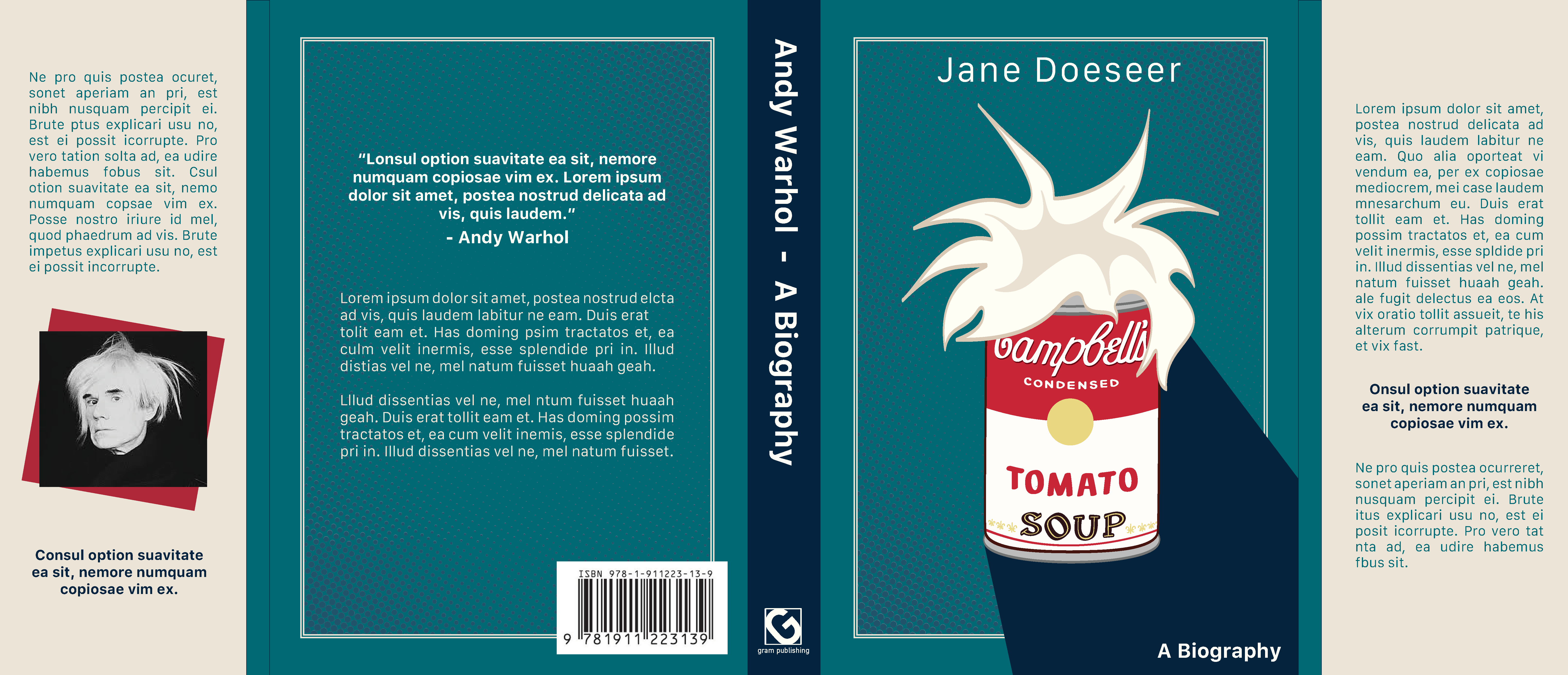 For the iconography on the book jacket design, I decided to use the infamous Campbell soup can, adorned with a tuft of Andy’s signature hairstyle. I thought it was such a silly but accurate way to portray Andy Warhol in a simple graphic. The soup can took me much longer than it should have as I could not find the exact font for the Campbell’s logo, so I decided to just hand letter it myself. I then moved on to the rest of the book cover which I kept relatively simple with a calming color palette and a subtle halftone to incorporate some of Andy’s pop style. I really liked how this project came out and learned a few things, which is always good!! 🙂