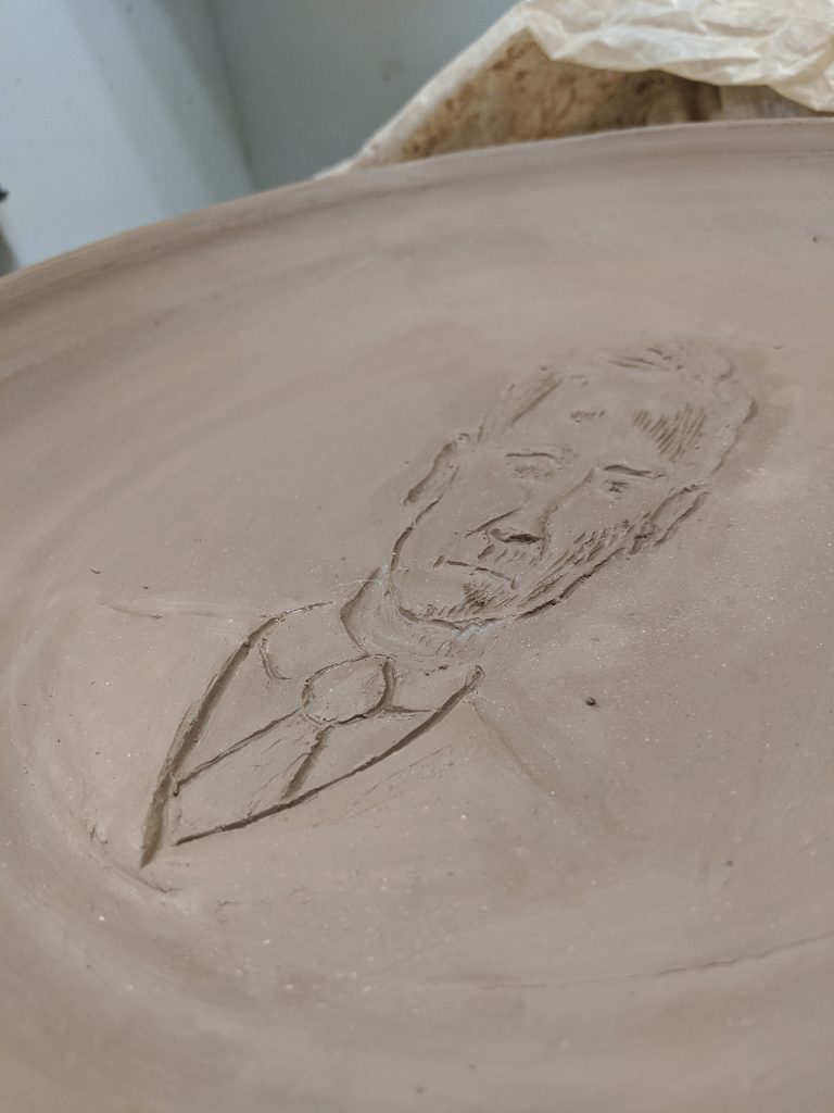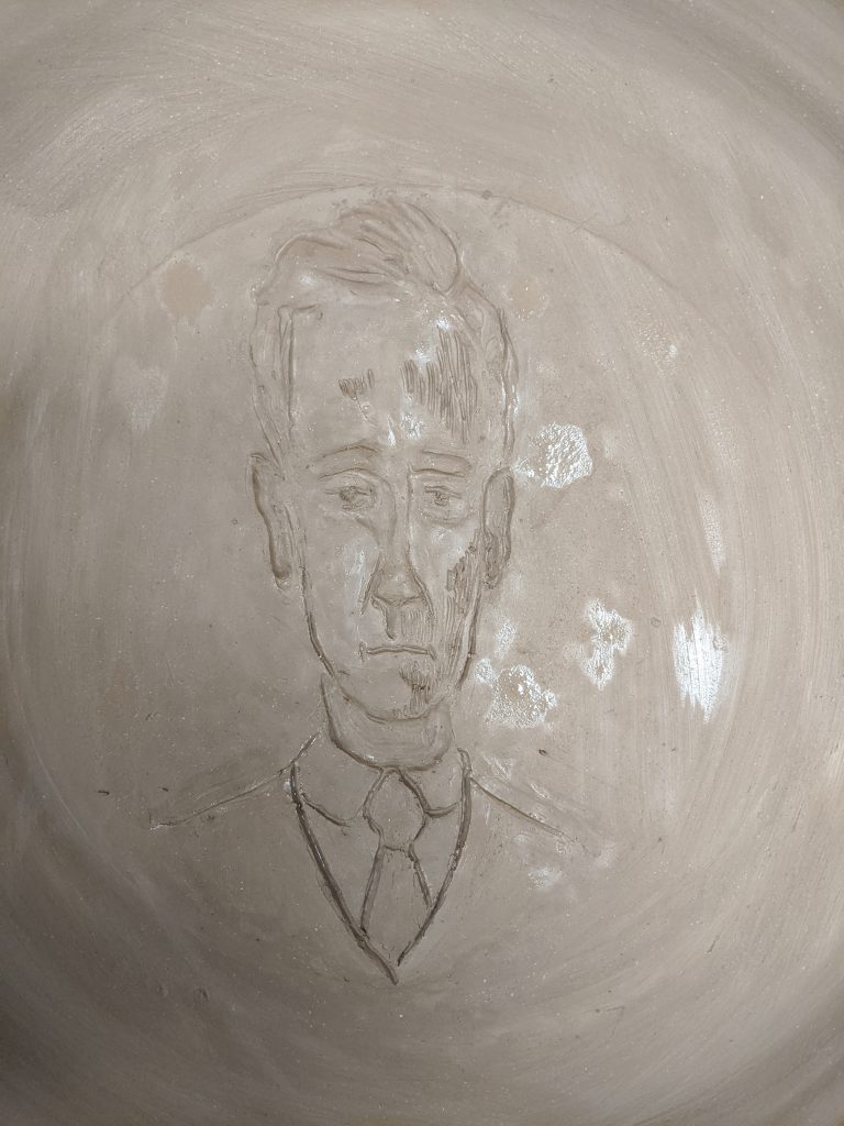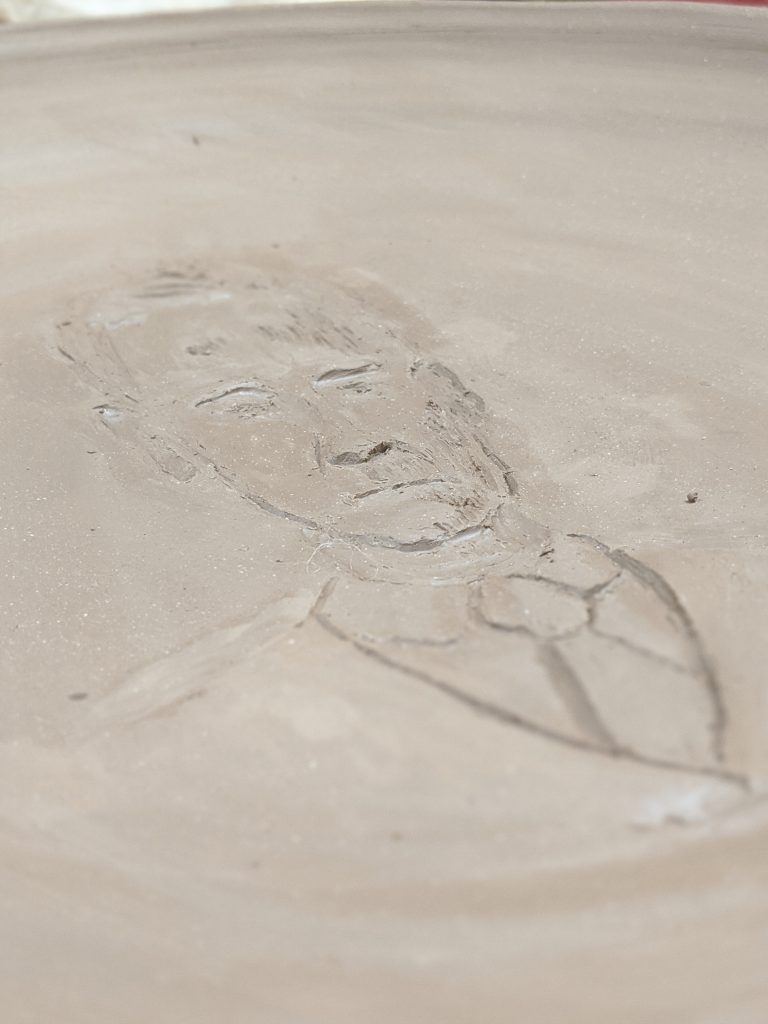 Drawn and sculpted on another large platter is this portrait / charicature referenced off one of my own sketchbook illustrations. I built this one up and made it more of a relief sculpture playing with shape and depth on a larger scale.
