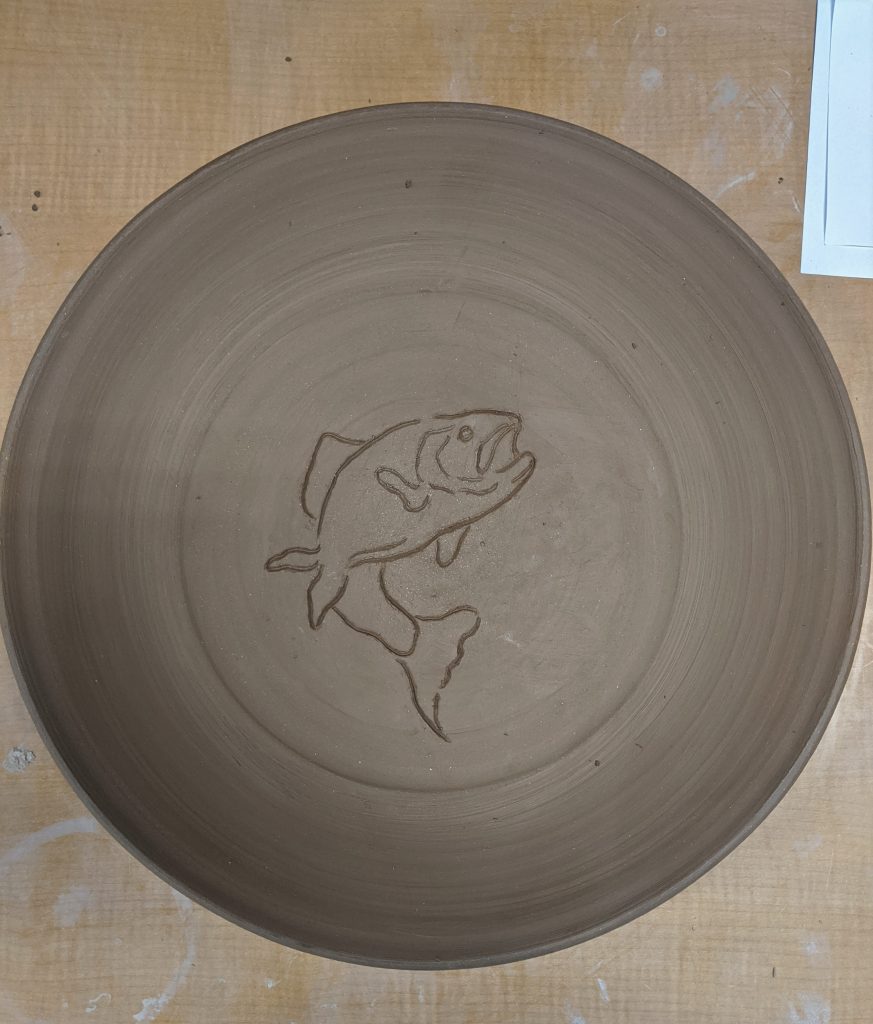 The charger platter was adorned with an illustration I’ve done of a brook trout. The above photos here show the process from when it was thrown on the wheel to when it was dried, trimmed, and carved into – ready for bisque firing.