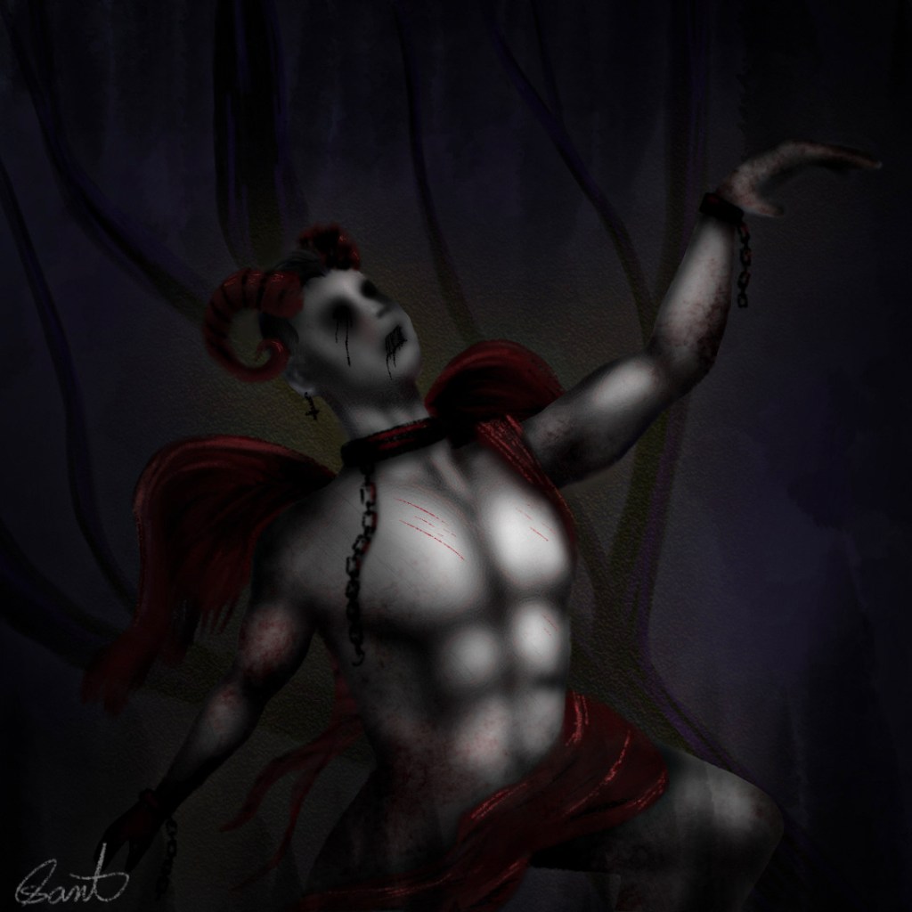 I was inspired by Maxfield’s color choices. I utilized cooler colors for my background and warmer colors to contrast the subject in the foreground. I illustrated the fallen angel in a classicism style. Moreover, I recognized Maxfield’s usage of dramatic poses and drapery. Hence something I wanted to incorporate into my own work. As for the background, Maxfield often emphasized the beauty of nature with trees, mountains, etc. To harmonize the theme of my piece, I illustrated a dead, decaying tree in my background.