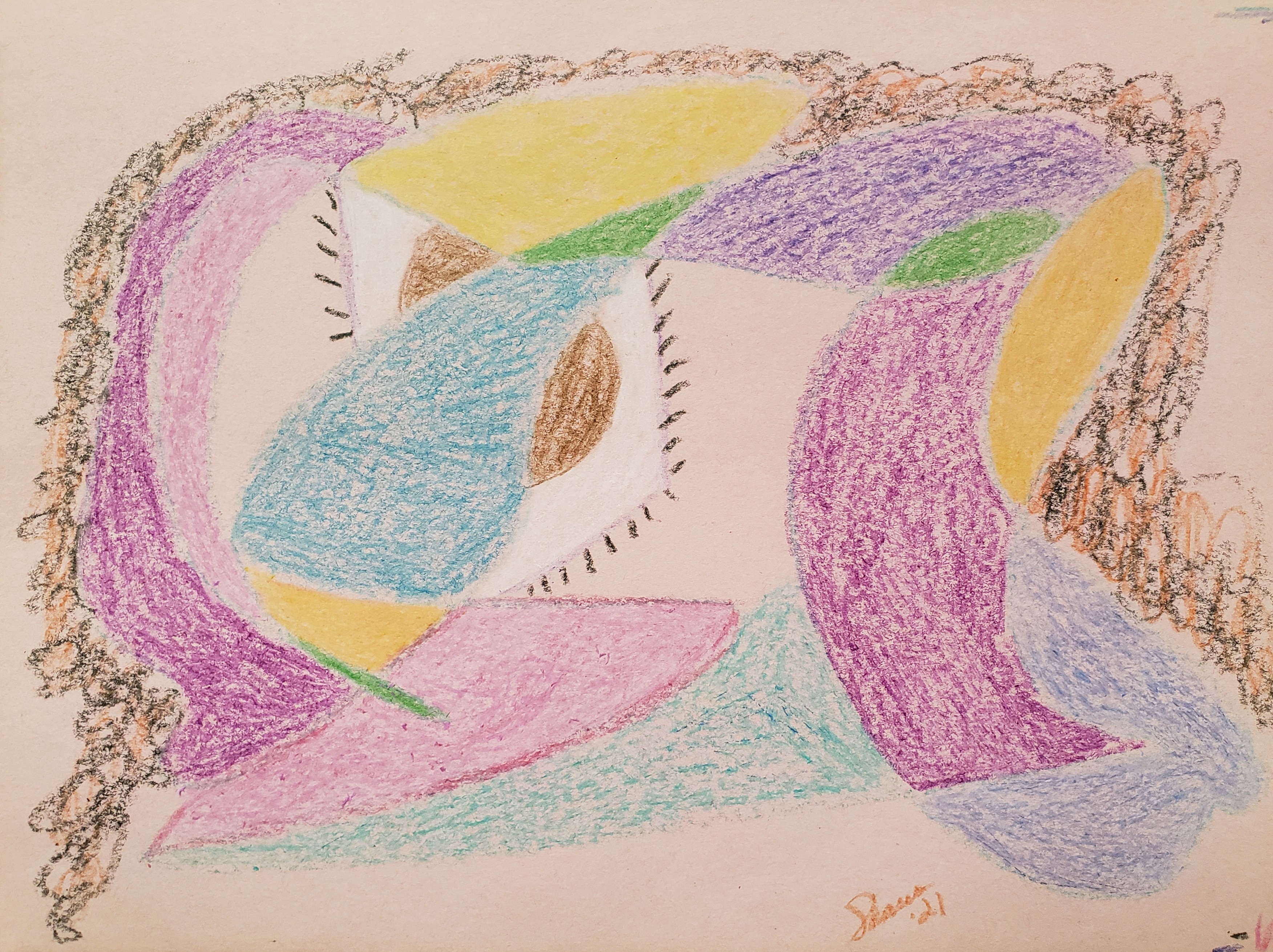 I decided to start off with a scribble drawing and let my intuition select colors for both the paper and the drawing. I was not too surprised to have grabbed pink construction paper as pink signifies love and compassion for myself and others. It also ties in with the heart chakra, as does green. Studying the shapes I could see a very Picasso-like image of my face, which made me laugh. I mean who would not love to have a large teal nose!