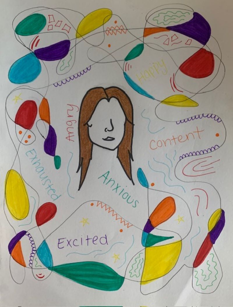 For the first art therapy course, I wrote a final artist statement and created a final artwork. In the statement I spoke about the different approaches in art therapy that I really enjoyed learning about and how I may use it in my future career, and in the artwork I created a line drawing with a female head and emotions written around her (picture on the right). I chose to create this because these elements are part of different techniques to use in art therapy such as flow, mentalization, being in tune with emotions, and how to represent what and/or who protects you. This piece was fun to create because I was able to base it off of myself and enjoy the process of art therapy.