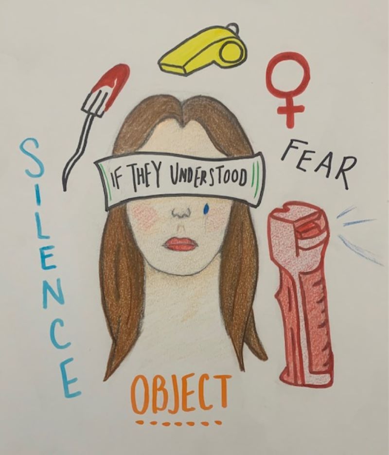 My second art therapy final artwork is based on a group project that I partook in this semester with other students. The project that we made was based on women’s safety and the importance of understanding the dangers that a woman encounters on a daily basis. Since this was the subject of our project, I chose to create a final piece that contributed to the same idea (picture on the left). In this piece I drew a female head in the center surrounding her with themes of necessary items that women need including, a tampon, pepper spray, and a whistle. I also included a few words that describe how women are treated in society: “fear”, “silence”, and “object.” My intentions for this final is to continue my passion for feminism, and keeping women safe because I believe it is incredibly important to know about no matter what gender someone is.