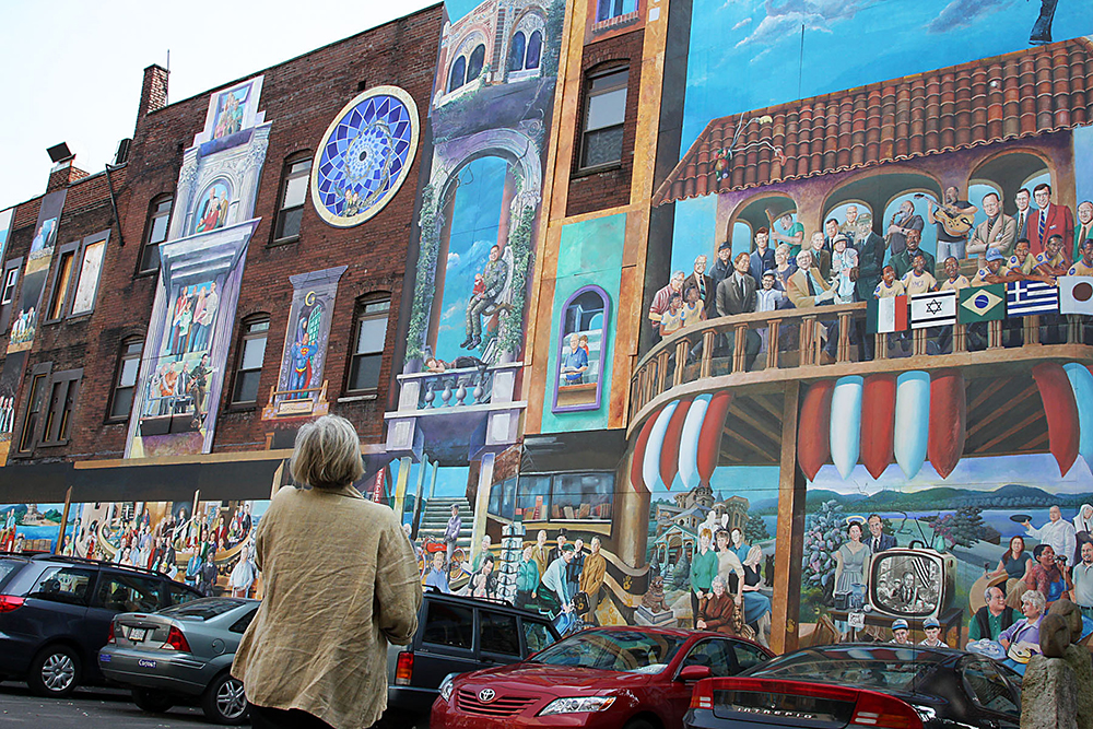 I have in mind one particular mural, called Inspiration Lycoming County by Michael Pilato. This piece of art is located downtown, where most of the town’s festivities are held. Pilato included important and inspirational people from Lycoming County as well as historical figures and events. The people included range from Martin Luther King Jr. to local teachers, as well as a small tribute to the events of 9/11 and the lives lost. Pilato portrays hundreds of years of the town’s history, all taking place on the world’s largest portrait mural. It spreads across three different walls (one of which being my favorite restaurant, the Bullfrog.)