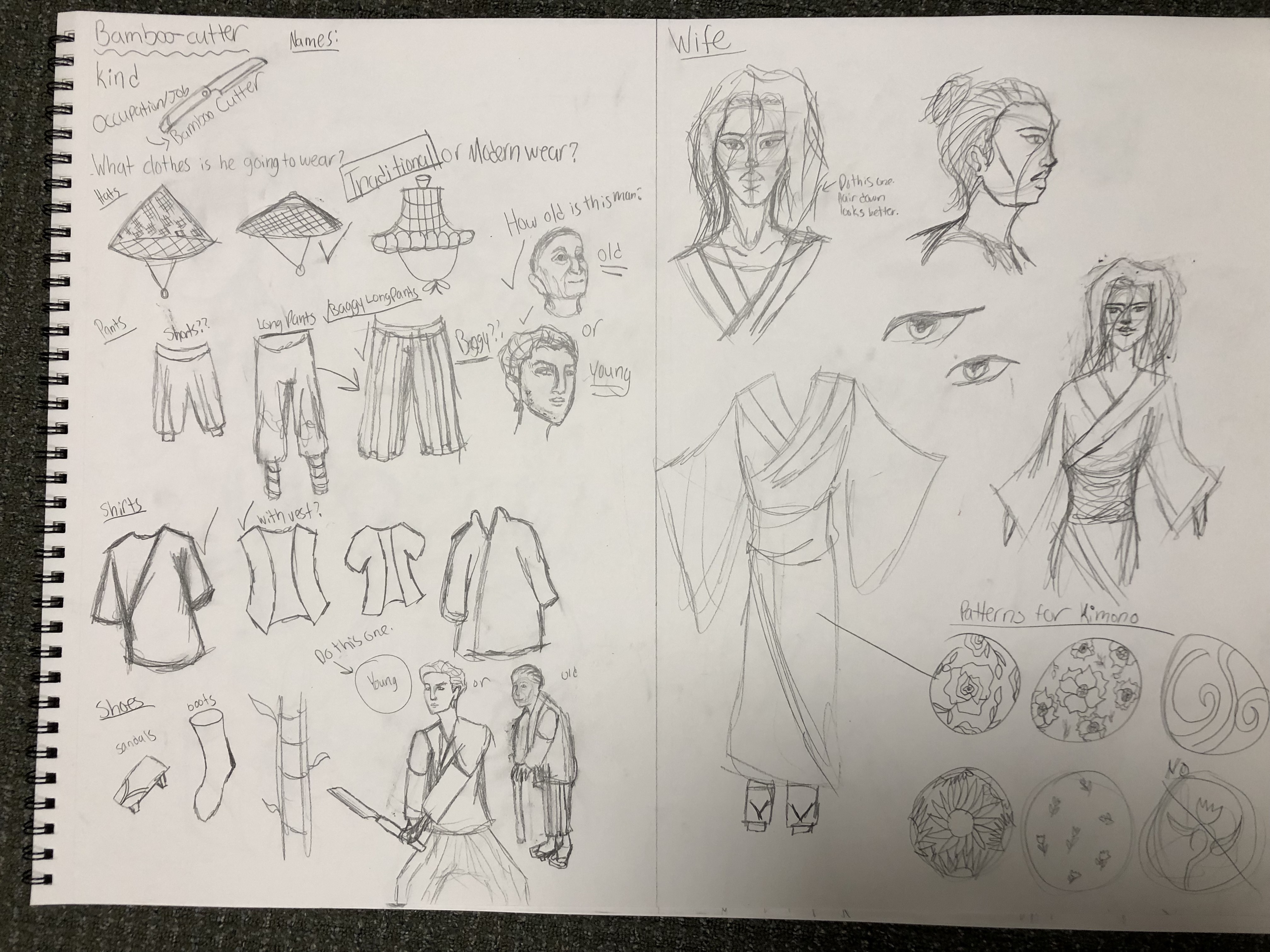 The first step was brainstorming. I never really brainstorm when I create art, I kind of just sit there for hours till a full concept comes to mind and then I just go for it. This process was very new to me. We were asked to just doodle anything that came to mind on the page that made us think of the characters of the stories we picked and it was a very interesting process. I picked a Japanese fairy tale called The Moon Maiden and there are four characters: the bamboo cutter, his wife, the moon princess, and the moon lady. Our doodles didn’t have to be perfect, our brainstorm sheets in general didn’t have to be perfect. Basically, I charted out what clothes they would wear and roughly what I wanted their faces and bodies to look like. Here are my sketches!