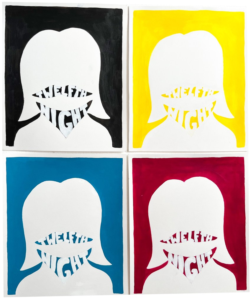 With this idea of masking identity I thought it would be cool if I was able to paint a poster that looked like it was designed on the computer, and then designed a poster that would look like it was painted in order to fit the theme of the Shakespeare play. Instantly the gears started turning as I noticed that some of the new paints I bought were of cyan magenta and yellow tones, more on the vibrant side of the color wheel. What’s more graphic design-ier than a CMYK color palette?!