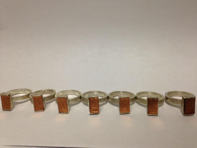 I then attached spruces to the wax rings and then onto button pieces attaching to a plaster mold for eventual melted metal to flow into during the casting process. Attaching the whole unit to a button that would soon be filled with plaster and then put into a kiln to fire in order for the wax to melt away, leaving a negative to create the positive. Once put through the casting machine where the silver metal was melted and shot into the mold, the piece was clenched, washed off and each ring was sawed off. After many touch ups the rings then went through a series of polishing with different functioning brushes on a polishing machine to get a decent shine.