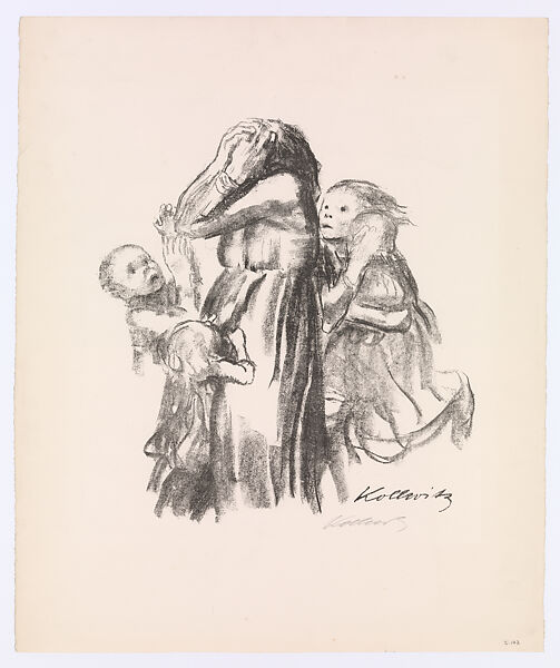 Käthe Kollwitz was a Prussian-born artist who lived through World War I and died at the end of World War II. She worked in a variety of media, originally studying to be a painter before transitioning into printmaking and sculpture. Part of her transition into printmaking is because of its ease of reproduction and distribution. Her husband was a doctor and with her studio attached to his medical practice, she would often draw the patients that would come in. Kollwitz had two sons and her youngest, Peter, volunteered at the start of World War I and died in October of 1914. This artist’s life was largely shaped by loss and devastation, so it is no wonder that she used her art as a tool to spotlight the downtrodden and oppressed.