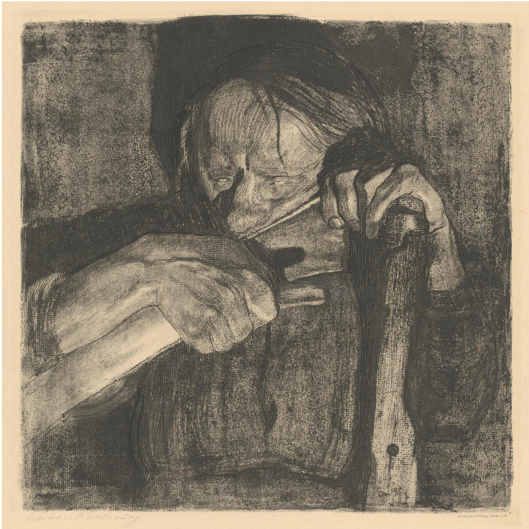 Käthe Kollwitz was a Prussian-born artist who lived through World War I and died at the end of World War II. She worked in a variety of media, originally studying to be a painter before transitioning into printmaking and sculpture. Part of her transition into printmaking is because of its ease of reproduction and distribution. Her husband was a doctor and with her studio attached to his medical practice, she would often draw the patients that would come in. Kollwitz had two sons and her youngest, Peter, volunteered at the start of World War I and died in October of 1914. This artist’s life was largely shaped by loss and devastation, so it is no wonder that she used her art as a tool to spotlight the downtrodden and oppressed.