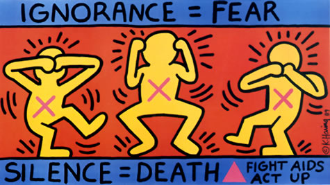Ignorance = Fear is a less positive piece compared to the poster as it focuses on the ignorance and silence surrounding the conversation and understanding about AIDS. It features the words “Ignorance = Fear” and “Silence = Death”, a message that hoped to promote a better awareness and understanding of AIDS as well as a way to help prevent it. The figures, who are marked with an x to symbolize them having AIDS, reinforce the silence and ignorance concerning AIDS at this time as they cover their eyes, ears, and mouth. Keith Haring himself suffered and died due to AIDS complications and so this message of awareness, conversation, and prevention became important in his art.