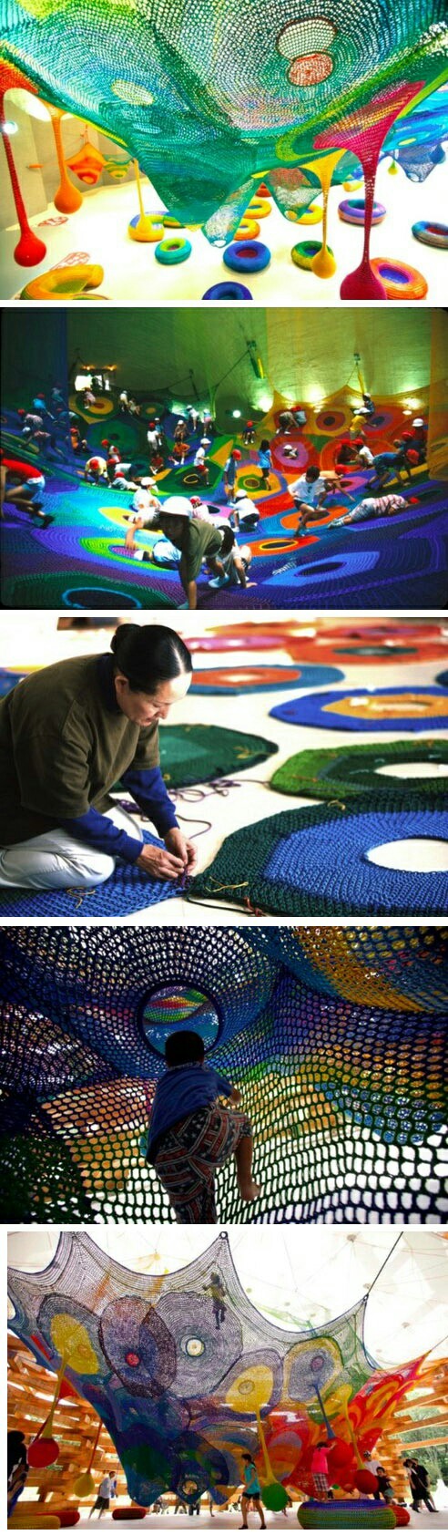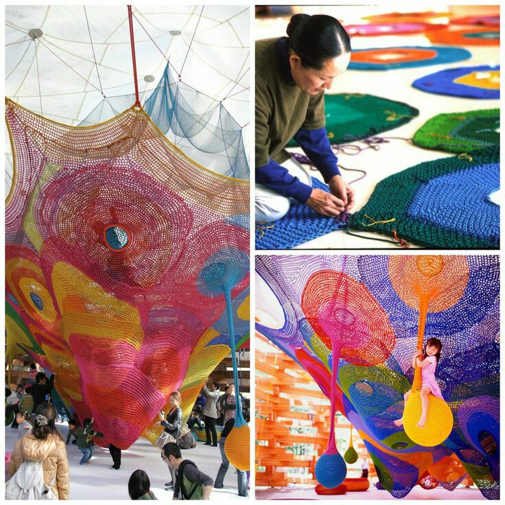 The playgrounds she creates combine childhood fun with colorful works of art. Not only are her playground sculptures appealing to the eye, but they also give children the ability to experience art in a whole new way. To create the playground sculptures, Toshiko crochets and knots a nylon like fiber together to make the flexible grounds. The nylon fiber, also known as Vinylon ( a synthetic Japanese made fiber) is hand dyed and knotted together by hand by Toshiko creating a hand made variety of colors and patterns.