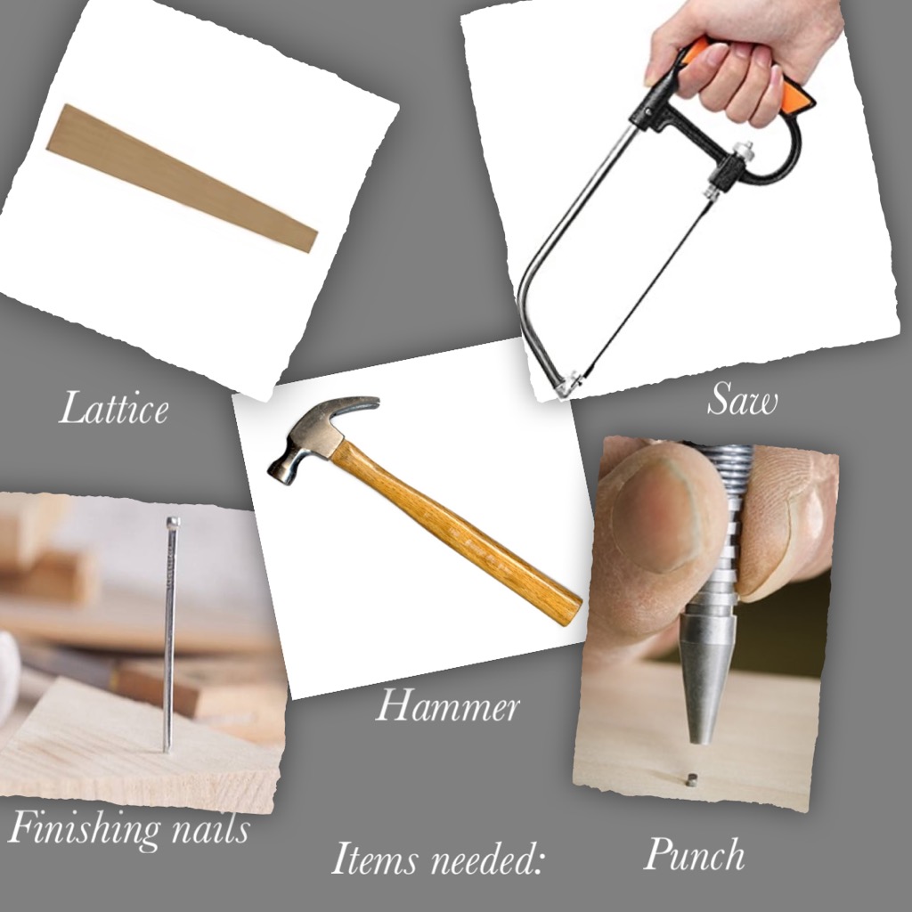 When you are ready to frame the artwork, you can do this with small finishing nails and a hammer. You can also use a brad nailer (nail gun), but this may split the lattice. If you are nailing this together by hand take a small punch and use it to push the nails a little deeper into the wood this will give you a cleaner look. There will be small spots in the frame where you nailed it onto the canvas that will show up on blond wood, but you can employ a small paint brush to fill the holes with stain or paint. In a pinch, I have even used a sharpie marker to color the holes as long as it is close to matching the color you have chosen.