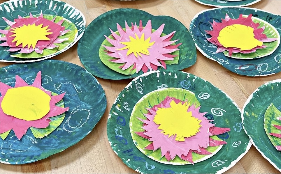 The first part of the lesson will be an introduction on Claude Monet and impressionism. This can include a PowerPoint with examples of his work and definitions of terms such as Impressionism, with a YouTube video, or with a picture book. The class will discuss the many paintings of water lilies by Monet and then introduce the project of creating water lilies with paper plates, construction paper, crayons, and glue.