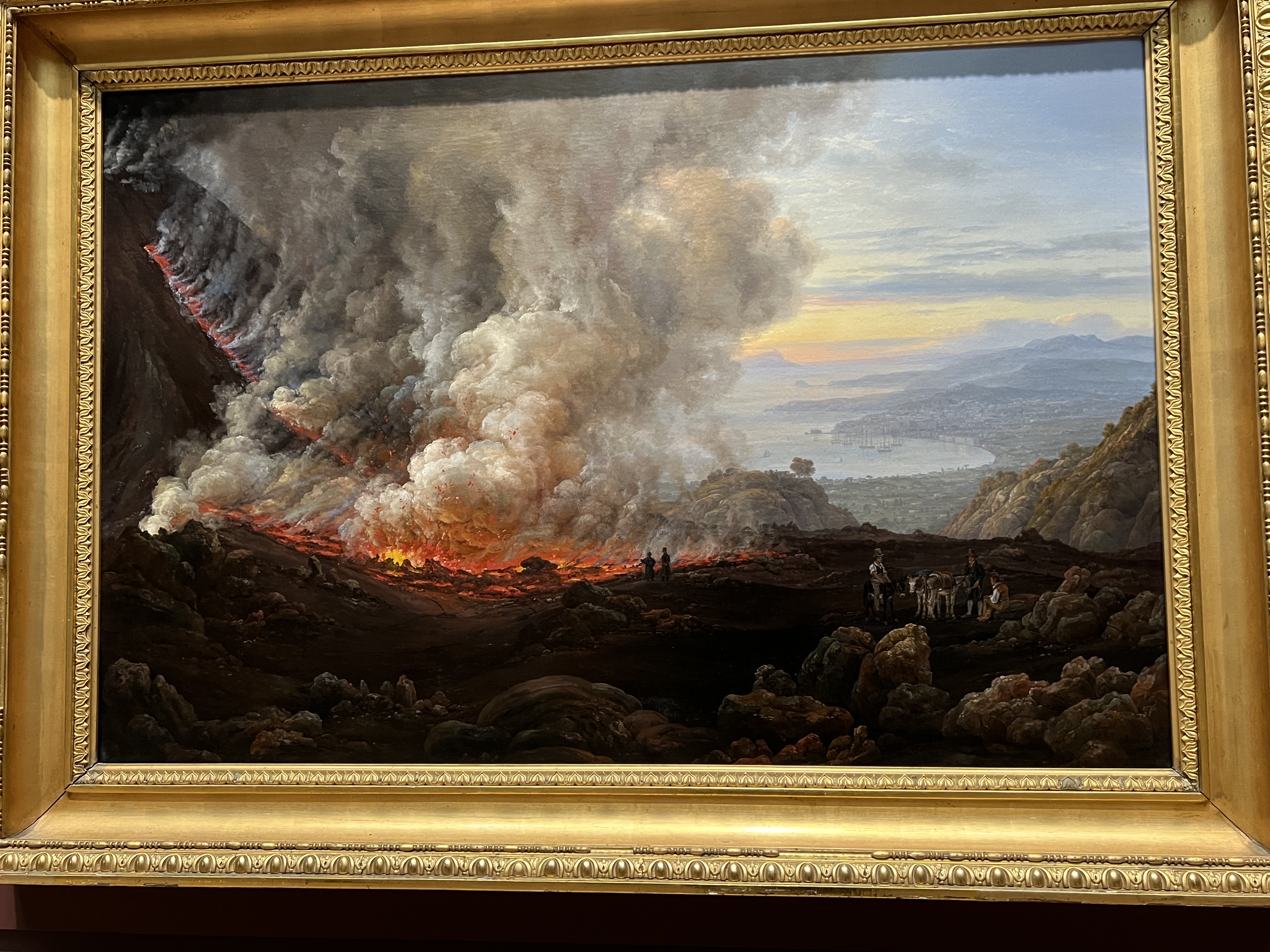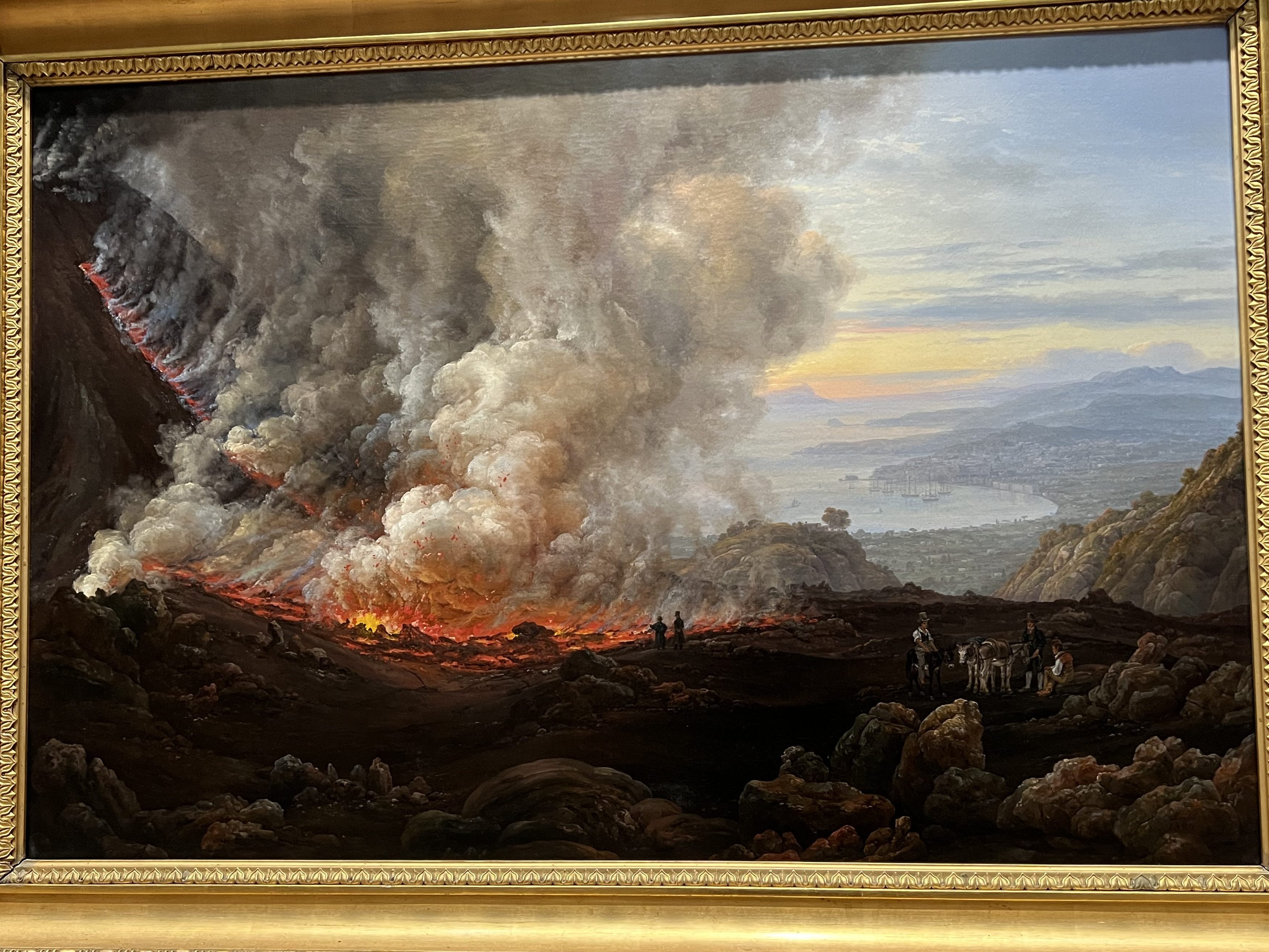 The sky on the right is one of my favorite things about this painting. Throughout the piece you see darkness, danger, maybe even some boredom from those that are standing around among the lava. That look of boredom indicates to me that this may be a common occurrence, I am not familiar with volcano eruption statistics so I can’t say for sure. I do think it’s weird they look bored. How can you be bored?