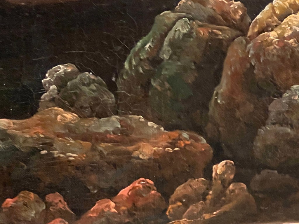 What really caught my eye in this painting is how vivid the reds and oranges are, especially in comparison to everything else. Getting in close to those details was fascinating. The embers floating in the air among the smoke gives the piece a slow motion movement of something that would have been moving much quicker. The use of yellow in the lava and flames indicate just how hot the substance is, and would have been as if you’d been standing right next to it. The smoke billows out as the intensity thickens. This is a rather violent scene from mother nature, but it’s not the only scene.