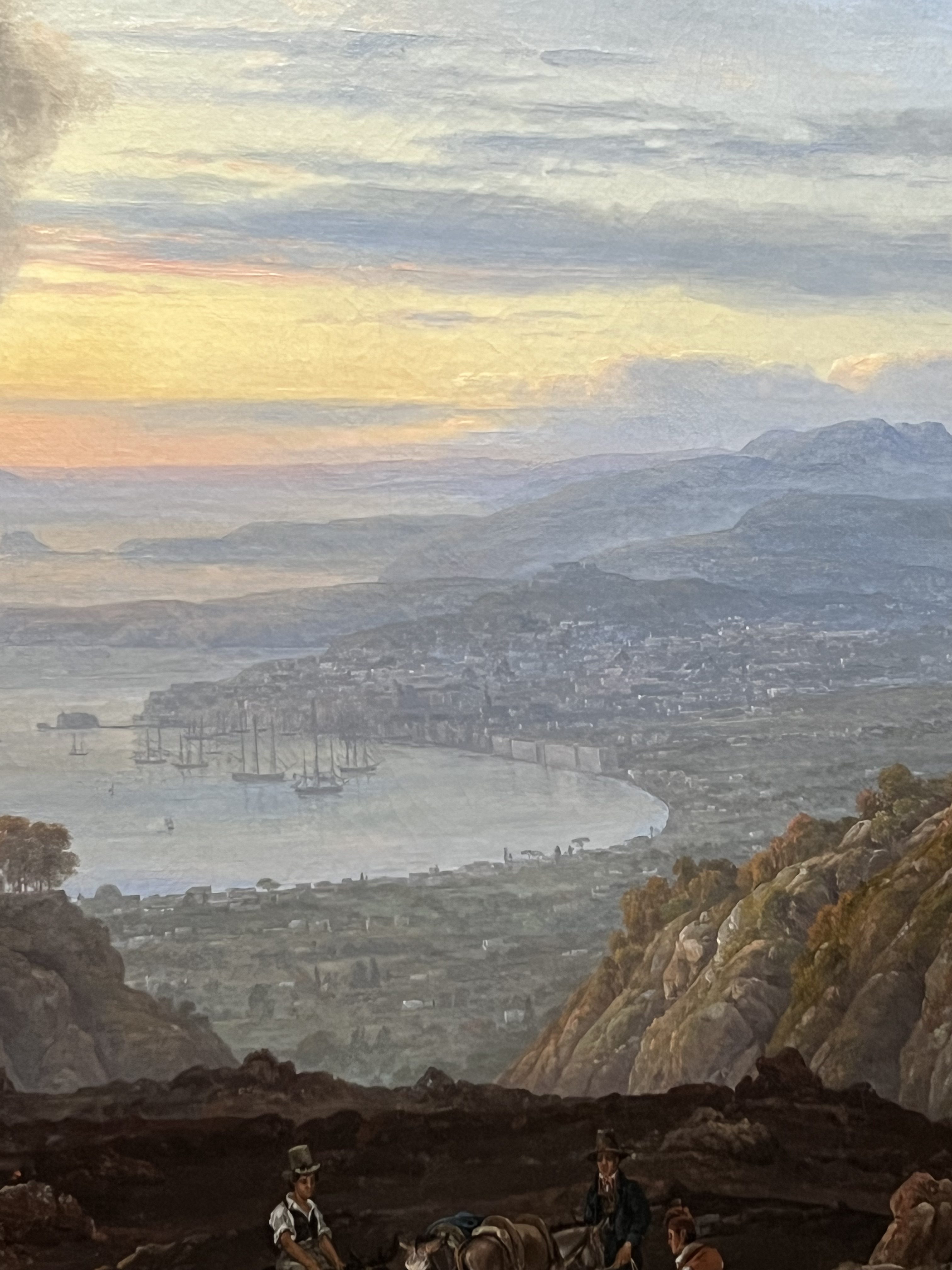 However, I love that behind this dark scene is a much brighter one. A beautiful sunset over a harbor, with the light from the sky coming down on everything surrounding it. You can see the foliage and houses far away, hopefully safe from Vesuvius. The blue light makes the town seem much farther away, while simultaneously giving a peaceful feeling for those below the mountains. The yellow in the sky still ties in with the eruption, just more subtly. The colors bring everything together into one cohesive piece, regardless of the different elements that were brought in.