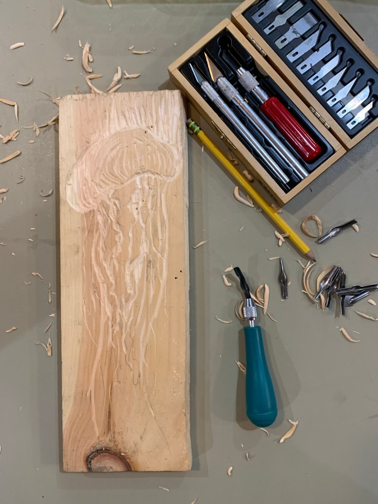 My first step was to grab my carving tools, and find old wood laying around my house to see if it could be repurposed. The wood I used was a soft type of wood so it could be carved into relatively easily. I sketched out my jellyfish and started carving away! I was not intimidated by the process but rather enjoyed all the steps along the way to get to the final prints.