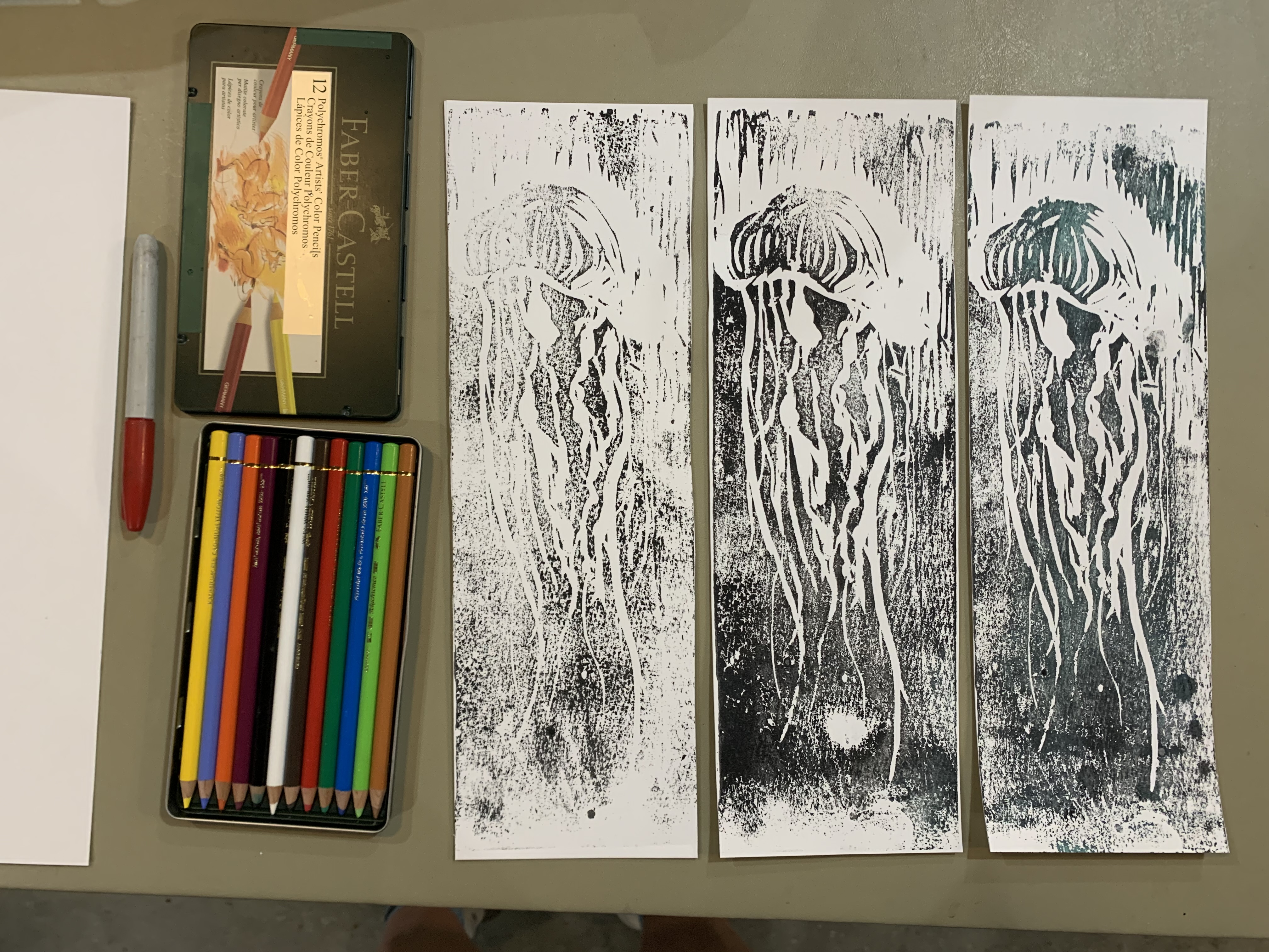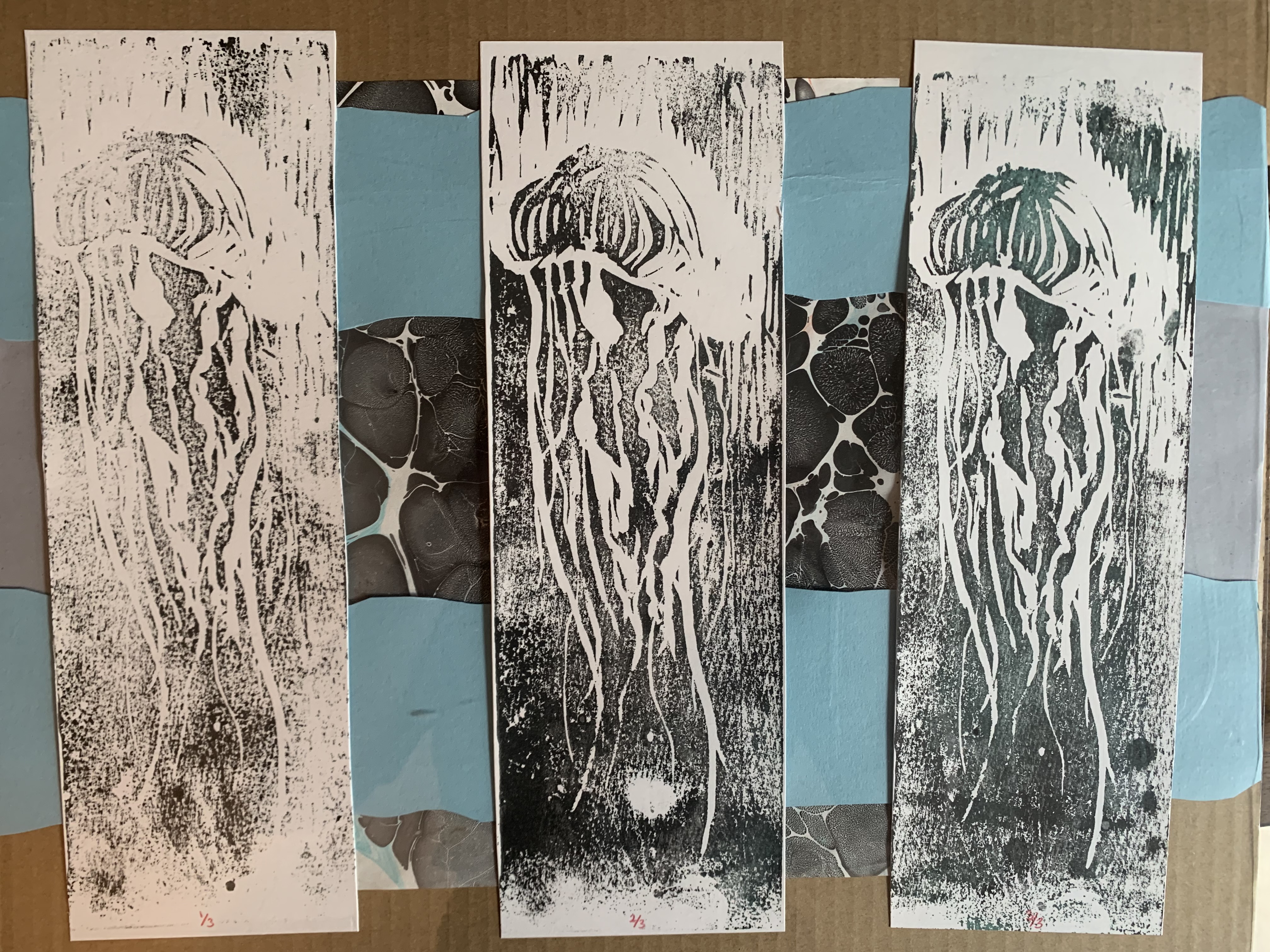 After finalizing my prints, I decided to dig through my piles of scrap paper to see what composition I could come up with that I felt suited my jellyfish set.