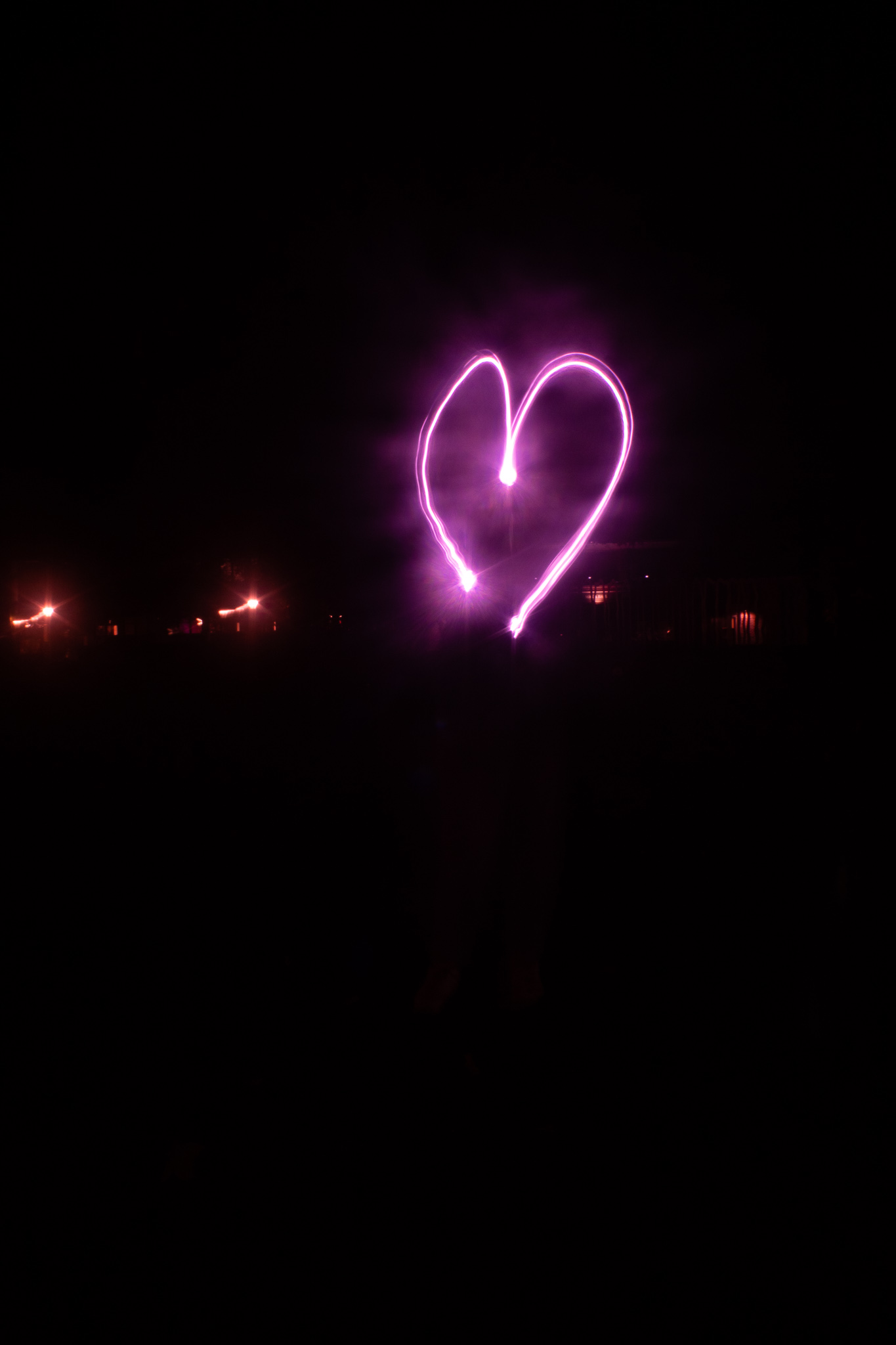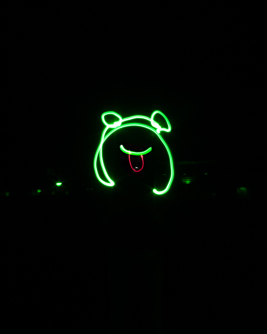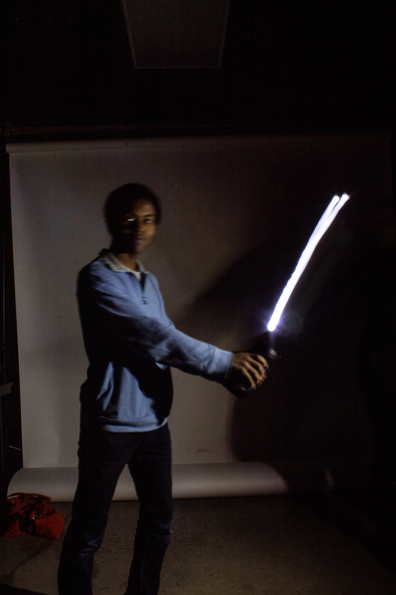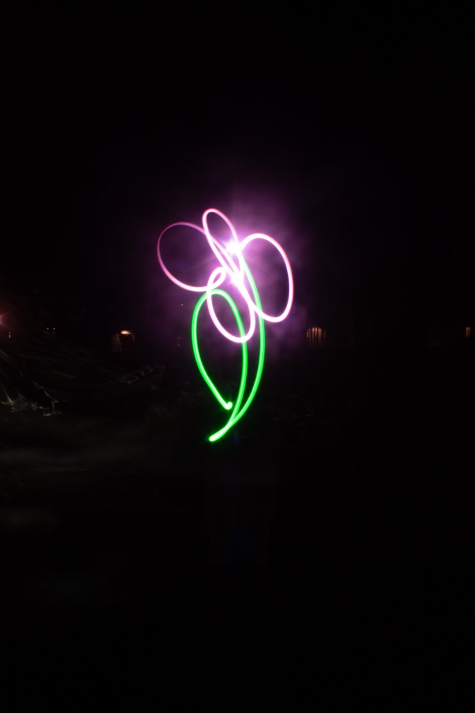 When taking these type of light painting photos I set my camera up on a tripod, and set my shutter speed to around 5-7 seconds. Then I had shutterbugs members take their turns standing in front of the camera and painting with their flashlights, creating whatever they wanted. Some chose to have a subject be in the light painting, which created some really fun shots! The subject has to remain very still which can be hard, so make sure to pick someone who has good balance!