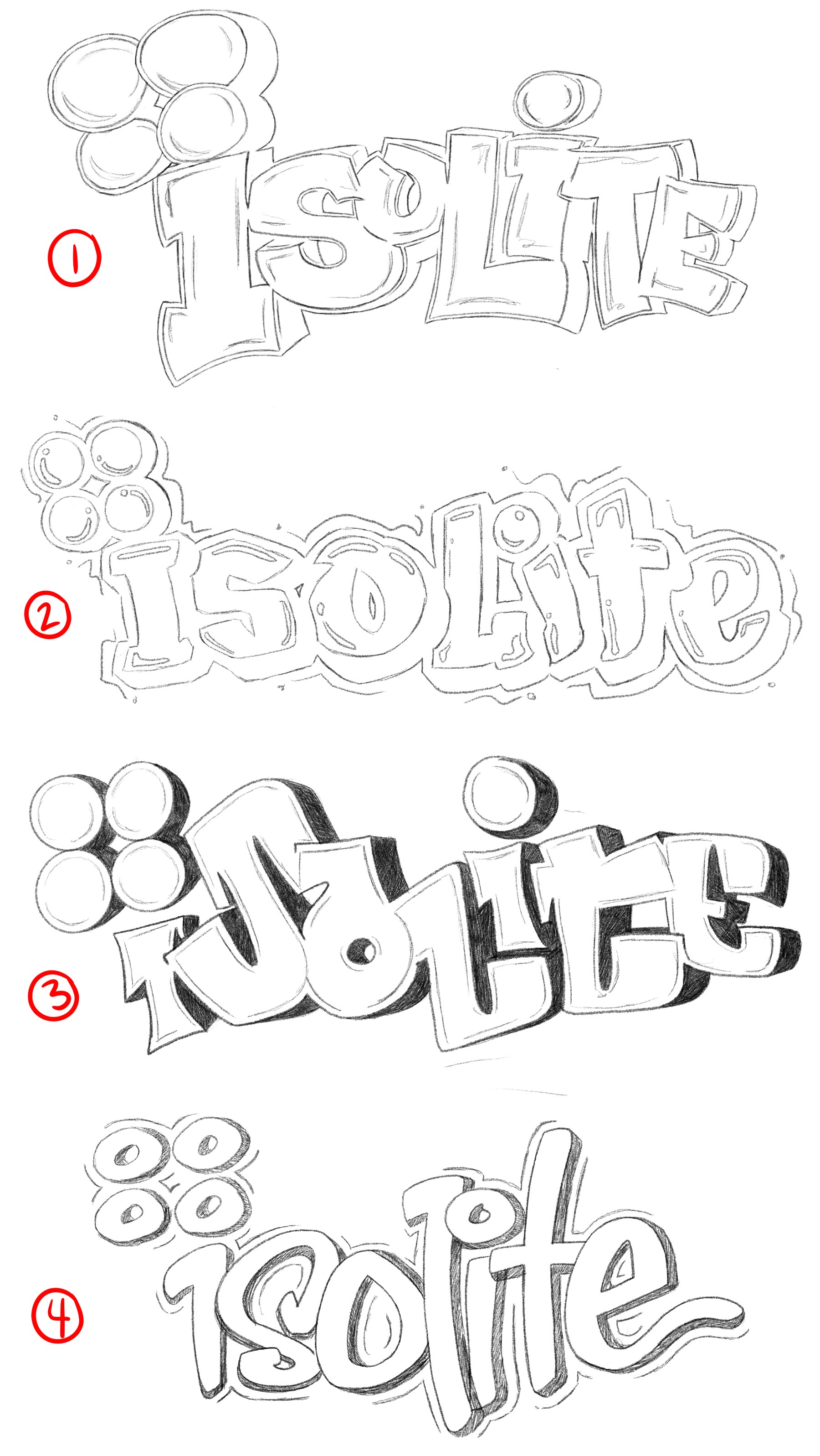 As I’ve established, I’ve never painted a mural before, so where does one start? With paint and materials in mind, I decided to start with designing what the mural would look like. I gave Isolite a rough timeline including dates they can expect rough/first drafts and what that would entail. The first draft would be narrowing in on a graffiti style for their logo wordmark, “Isolite,” I gave them 4 different options to choose from, they liked option 4 but wanted it to have the thickness of the others.