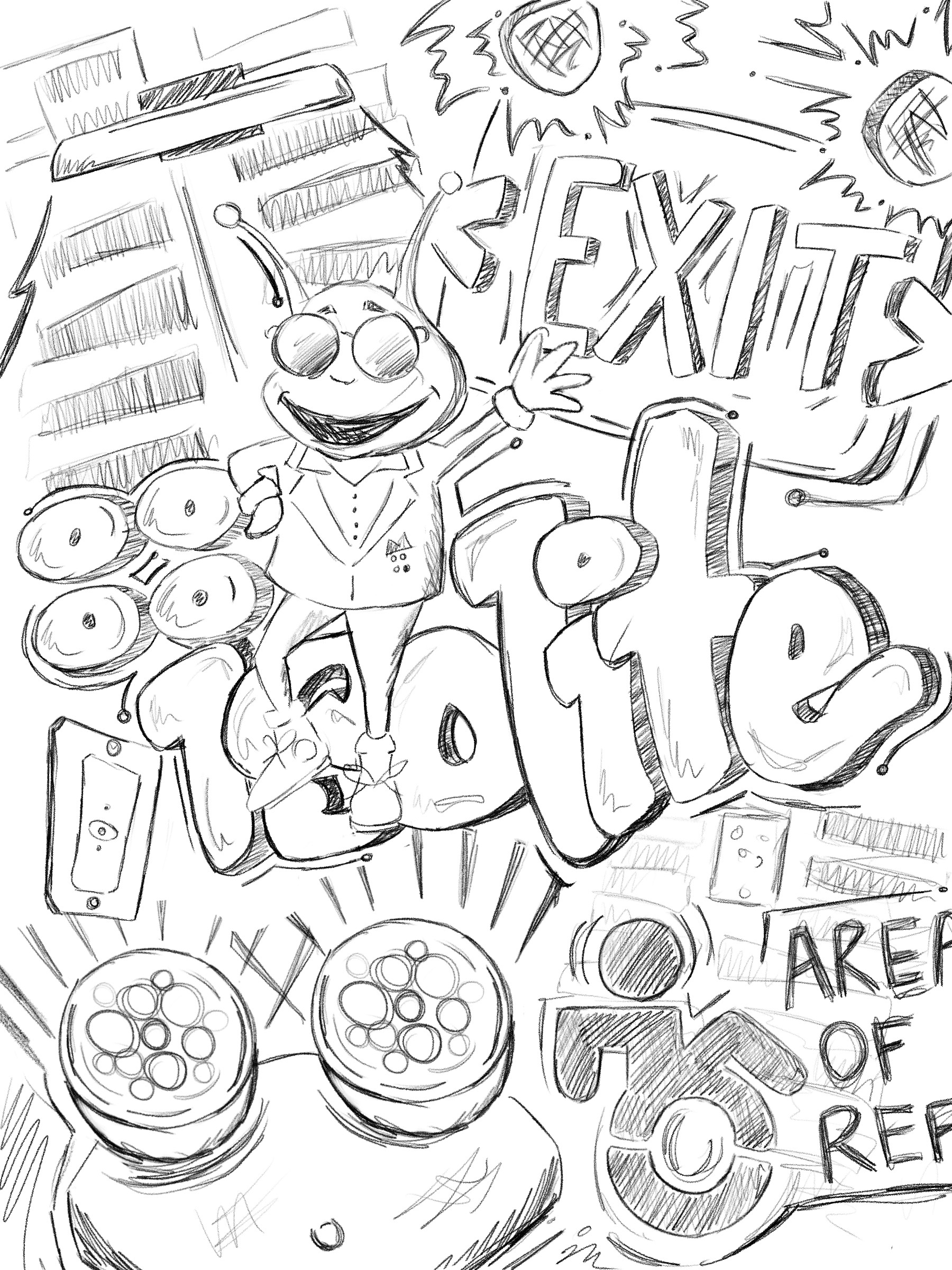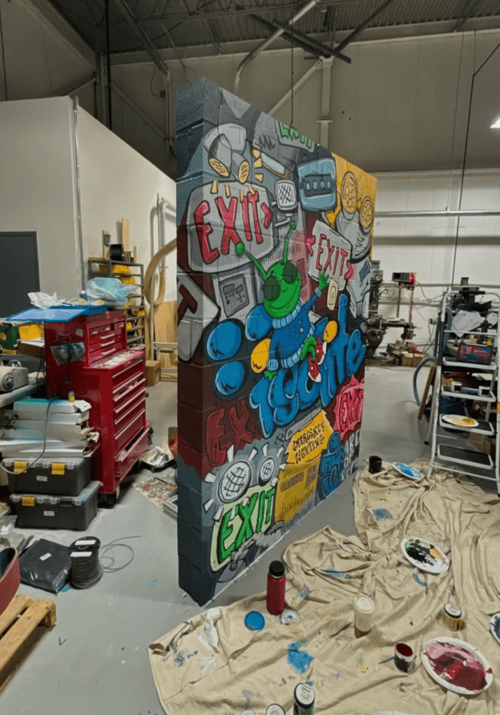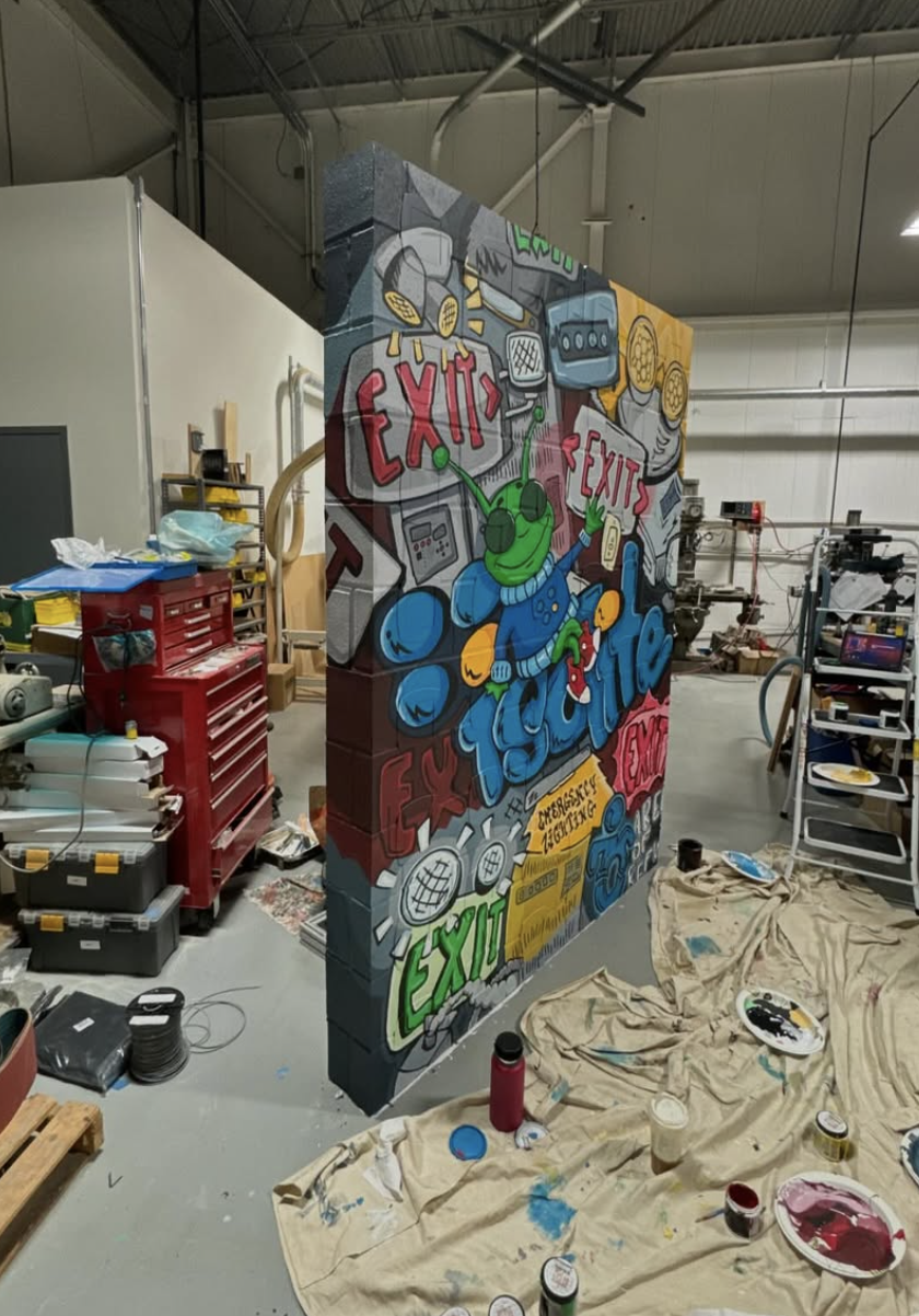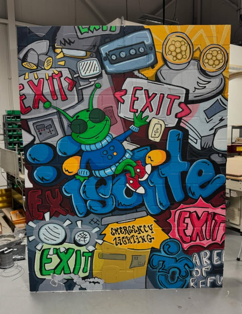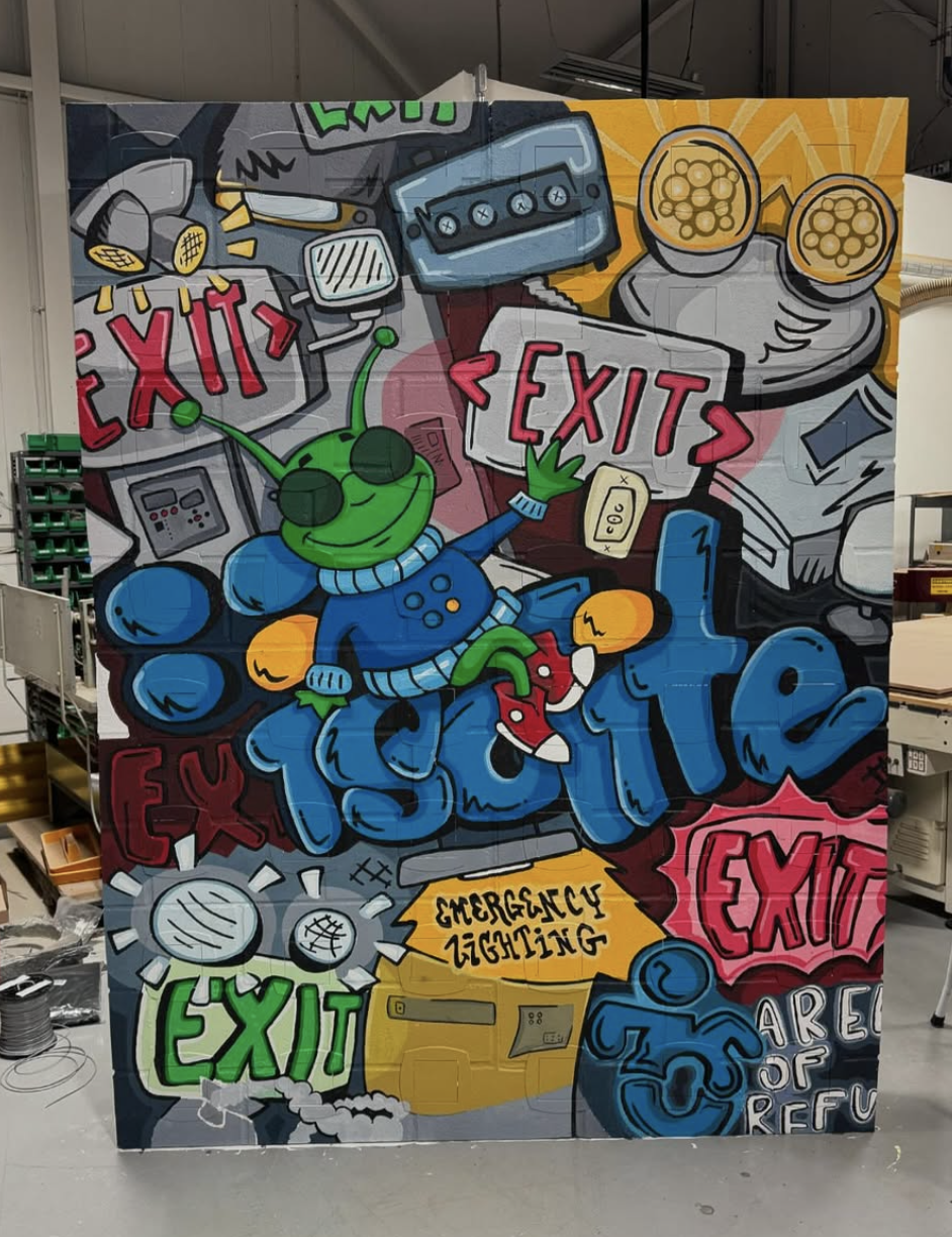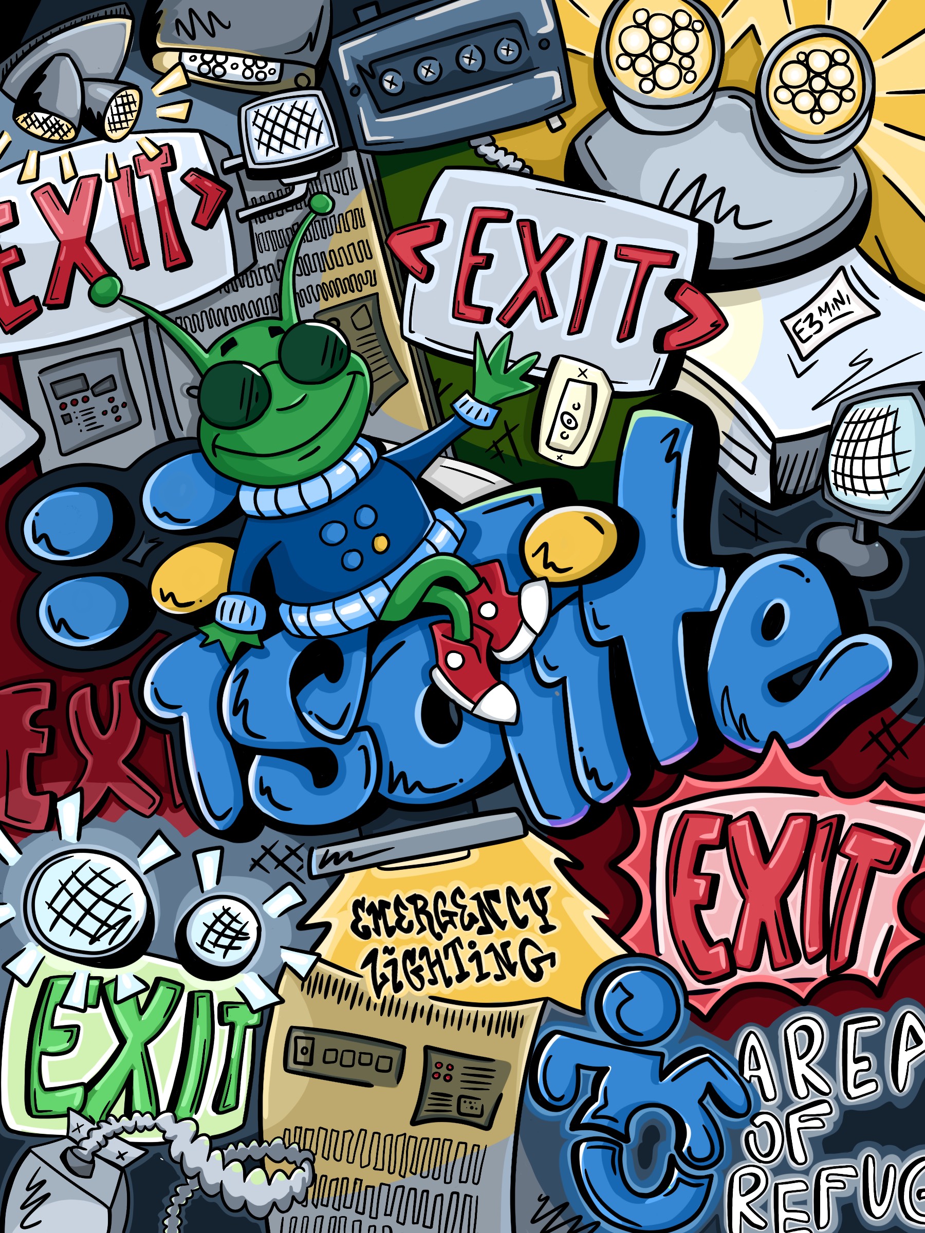 I found out that Isolite, last year, was attending the 2024 LEDucation Exhibition, where the lead engineer was bringing his latest project. To sum it up in non-engineer terms, the engineer created and programmed a grid of lights into a wall that would flip open and shut in a dance-routine fashion, in order to demonstrate how well these LED lights could be concealed. While the lights lay flush on the wall, you could still see the contrast of the gray, faux, cinderblock wall and the white light covers. Well, thats where I come in! The engineer mentioned he wanted a graffiti style mural, full of their products, their company name and their mascot, Lumi. Lumi? A mascot? I’m so intrigued, excited and can’t wait to see this little bugger… literally. Lumi is a kelly green lightning bug, dressed to any occasion and accessorized with red sneakers and sunglasses. He is a jack-of-all-trades and is frequently seen on Isolite’s Instagram page.